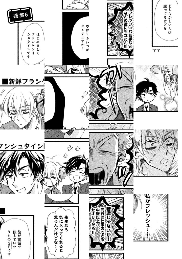 人間と共存するためには会社で頑張って働かなければ! モンスターなのに社畜となり、だれよりも真面目に、ひたむきに仕事に邁進するフランケンシュタインの日常。入社試験からSE課への配属。営業一課のエース・モテ作や、フランケンに惚れ込んでいる・ゾン子ちゃんらと繰り広げるフランケンの日常は現代日本のサラリーマンに働く意味を教えてくれる。命あるかぎり(もうないけど)社に忠誠を誓います!!