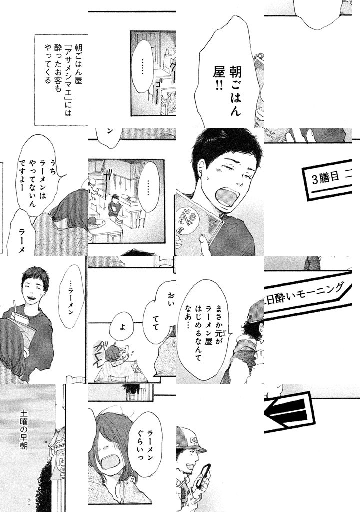 日高元、27歳。子供のころ食堂「アサメシマエ」に救われる。成長し、料理人になるも食堂の閉店を知り、一人娘・早夜子に店の再開を申し入れるが『なんで今まで本気でやらなかったの?』と突き放される。悩んだ元は朝ごはんの意味をみつけ…? 土鍋ごはんに卵黄のしょうゆ漬け、もっちりピタパン、胃にやさしい中華粥、大家族の朝パーティー手巻き寿司、貧血改善のおむすび朝ごはんなど垂涎のメニューの朝ごはん食堂漫画!
