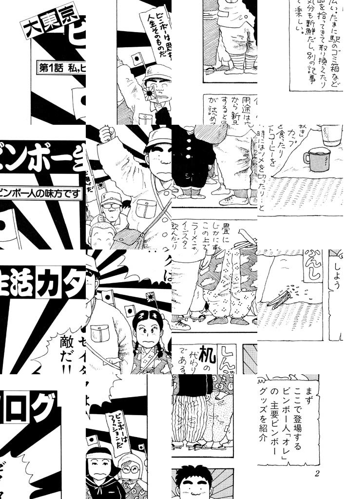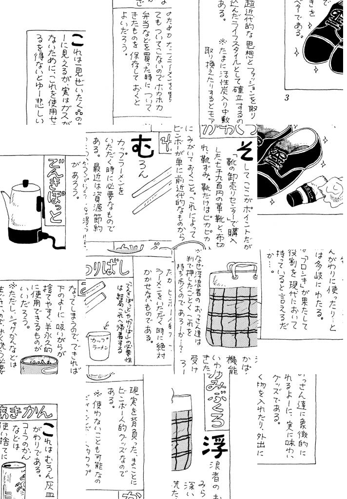 大東京で暮らすビンボーに欠かせないグッズとは? しんぶんし、あきかん、でんきぽっと、わりばし、かみぶくろ、そして「靴の卸売りセンター」で購入した1900円の革靴である。靴はいつもピカピカに磨いておくこと! こうすればビンボーが前近代的なものから、超近代的な思想とファッションを取り込んだライフスタイルとして確立するのである……。まるで歳時記のような、四季を感じる楽しいビンボー生活マニュアル、お教えします!!