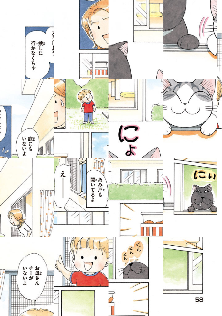 初めてのお散歩で迷子になった子猫が、親切な山田家に拾われ、落ち着くまでのストーリー。山田家でチーという名前をつけられた子猫が、新しいお家を自分の「おうち」として認識するまでを描く。
