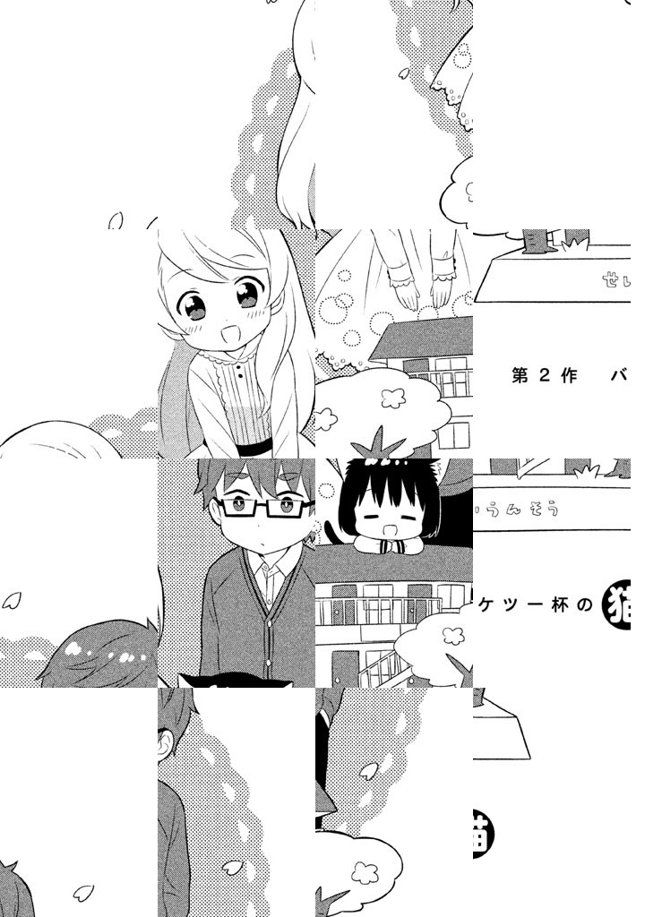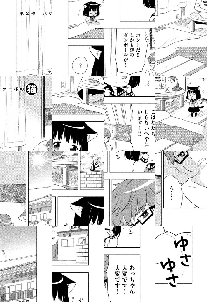 ねこはだいたい二足歩行! 超オーソドックスなねこ、こはなは二足歩行で人語を解し、ささかまやクッキーが大好き。セーラー服を着ているようにも見えますが、多分これが地毛のようです。頭がやや大きいのでバランスは悪いですし、食い意地も張ってますが、基本いいこねこです。飼い主あっちゃんや、ボロアパート星雲荘の変な住人達とこはなの、ほんのわずかドラマチックで、結構ささかまな日々。