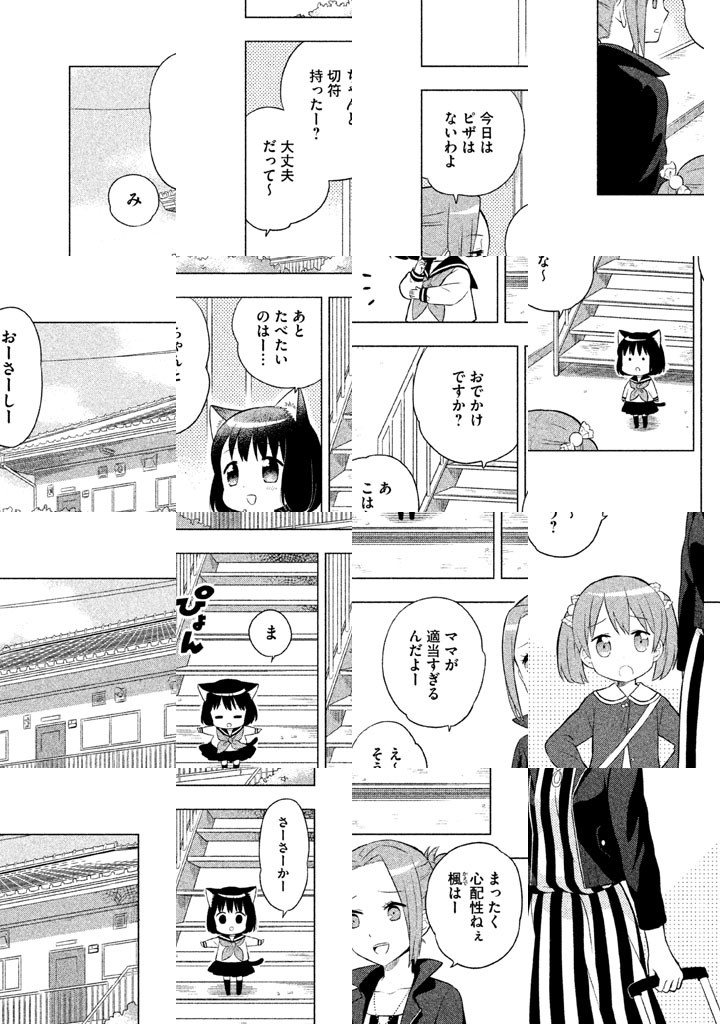 ねこはだいたい二足歩行! 超オーソドックスなねこ、こはなは二足歩行で人語を解し、ささかまやクッキーが大好き。セーラー服を着ているようにも見えますが、多分これが地毛のようです。頭がやや大きいのでバランスは悪いですし、食い意地も張ってますが、基本いいこねこです。飼い主あっちゃんや、ボロアパート星雲荘の変な住人達とこはなの、ほんのわずかドラマチックで、結構ささかまな日々。