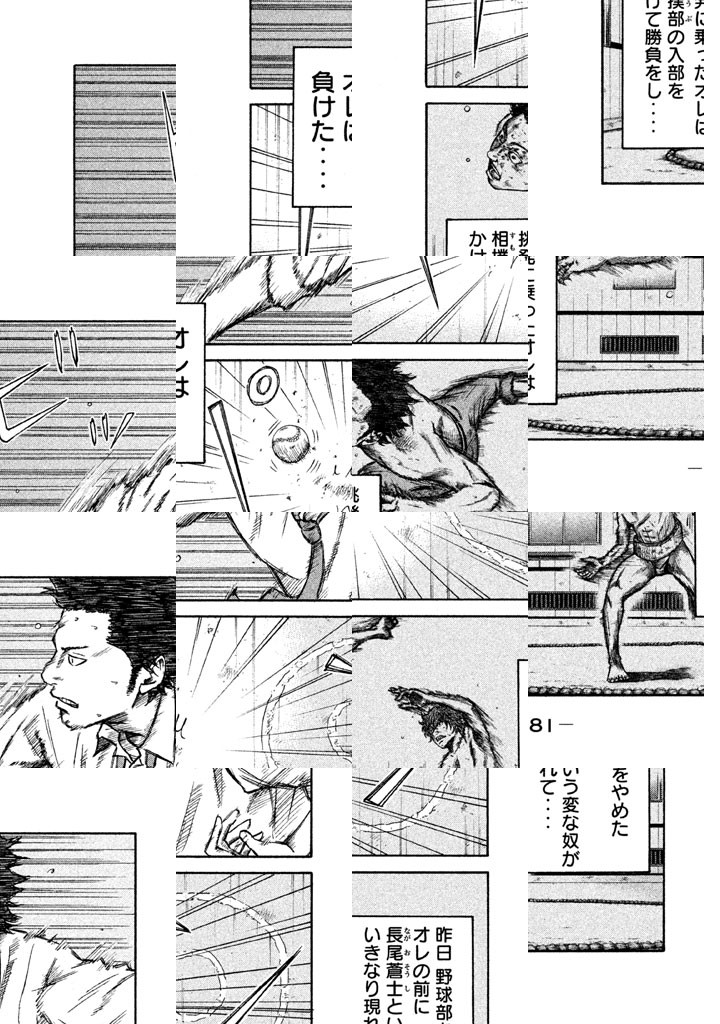 青楓高校1年の甚野新太は将来を嘱望される投手だったが、慢心が招いた怪我で左目の視力をほぼ失い、野球の道を絶たれてしまう。そんな時、相撲部主将の長尾蒼士が、勧誘のため新太の前に現れた。 男たちは出会いは今、雄々しく、眩しく、煌めき始める‥…!! カッコイイってなんですか? カッコワルイってなんですか? 高校相撲ぶちかまし青春ストーリー!!