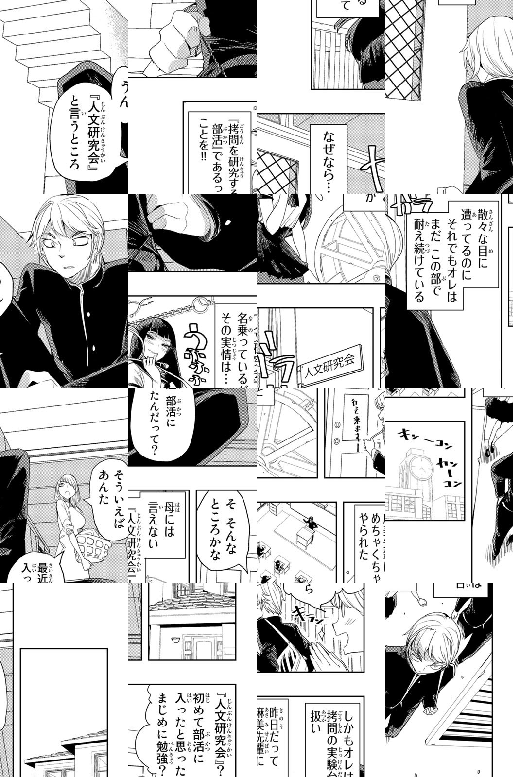 ──人類の歴史は拷問と共にあった!? 彼女を作り、楽しい高校生活を送ろうと夢見る石丸大人・高校1年生(童貞)!! クールな麻美(スレンダー)とキュートな清香(巨乳)、二人の美女の誘惑(勧誘)を受け、『人文研究会』に入部することに!! しかし、その実態は…ちょっぴりエッチで楽しい拷問研究の部活だった!?