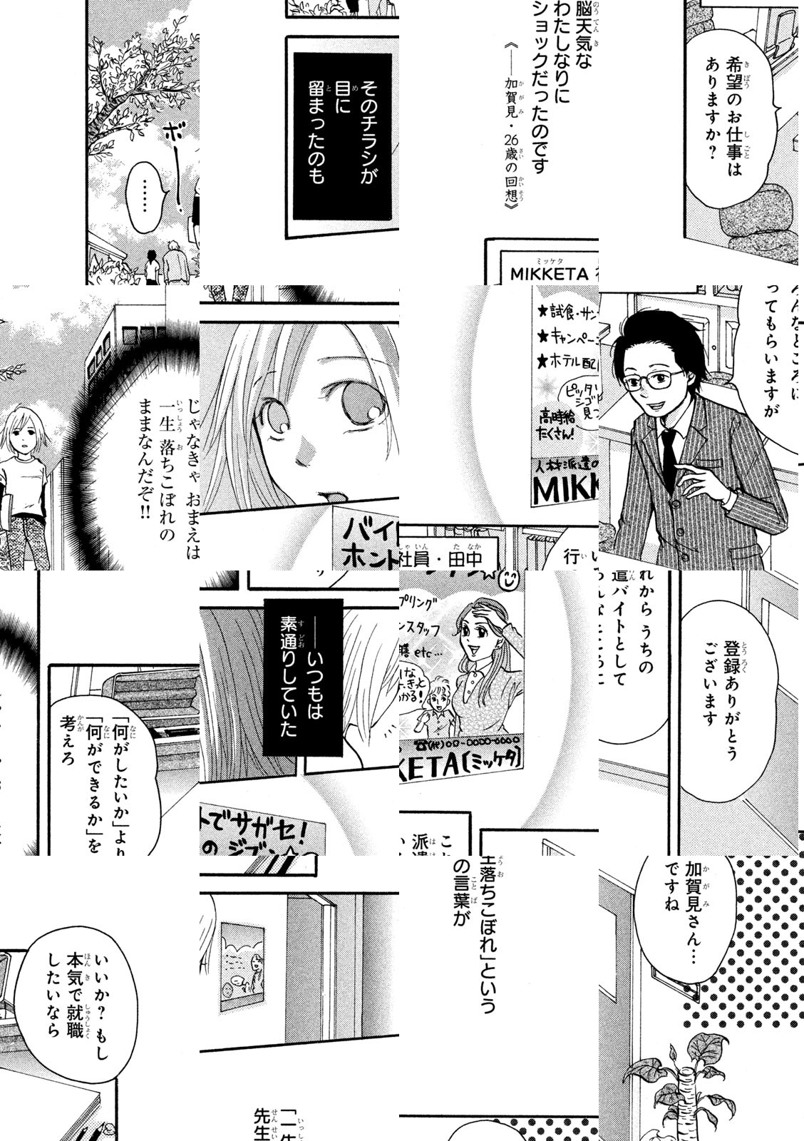 落ちこぼれの美大生・加賀見。デキル女を目指して派遣バイト登録会社「MIKKETA」に入り、ヌードデッサンモデル、ビラ配り、着ぐるみと、数々のバイトにチャレンジ! 「働く意味」なんて見つからないけど、「楽しく働く」ヒケツはいっぱい。お笑い芸人・渡辺直美さんと加賀見がファミレスで働くスペシャルバージョンなど単行本のための描きおろしも満載です!
