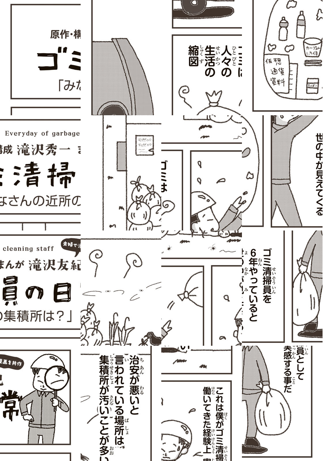 Twitterでバズりにバズり、2600万インプレッション超えのエッセイ漫画!SNS発の漫画の最終兵器!売れない芸人・マシンガンズの滝沢秀一は家族を養うためにゴミ清掃員に。何気ないゴミ清掃員の日常。その生活で見つけたゴミの知識やちょっとばっかりの幸せを届けます。滝沢秀一がネーム原作を、それを妻である滝沢友紀がタブレットひとつで作画。夫婦共作(どっちも漫画描いたことない)でおくるエッセイ漫画です。