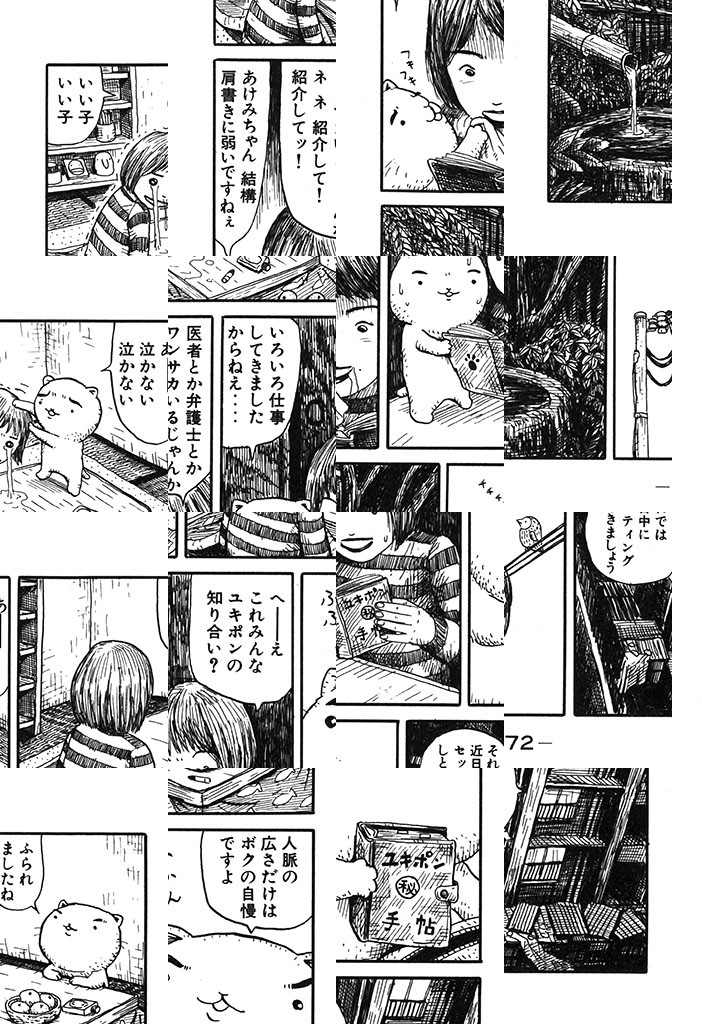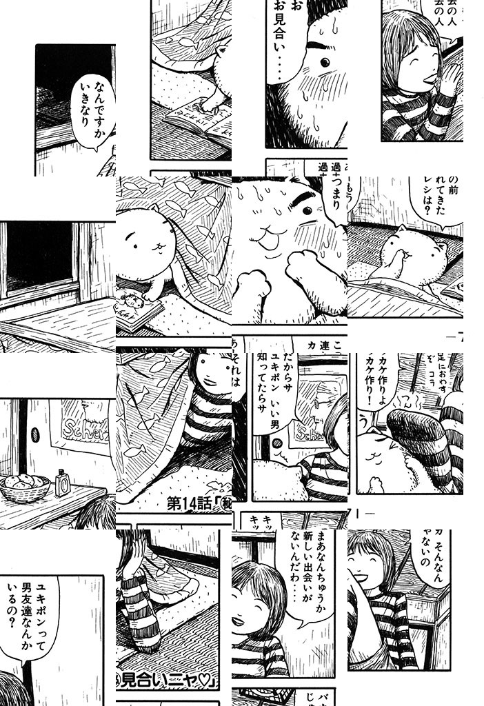 ただ今、お仕事中ニャクズで酒飲み、おまけにふしだら。6畳1間のフリーターご主人・あけみちゃんのために、超ケナゲな働き猫・ユキポンが、せまい額に汗して、今日も一生懸命がんばっているのです。