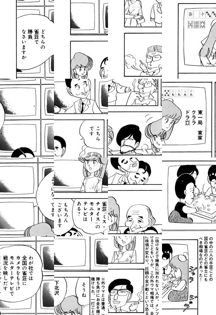 心地良い連続音と共に、やってきました持杉(もちすぎ)ドラ夫(お)!! 次々と現れる迷走雀士をものともせず、タタンタタンタンタン♪とサンバのリズムに乗って華麗に牌(パイ)を引く姿は、もはや麻雀が芸術の域まで達したような(!?)錯覚すらおぼえてしまう。息もつかせぬギャグの嵐があなたを襲う! 世紀のバトルロイヤル開始! これぞ、麻雀漫画の真骨頂!!
