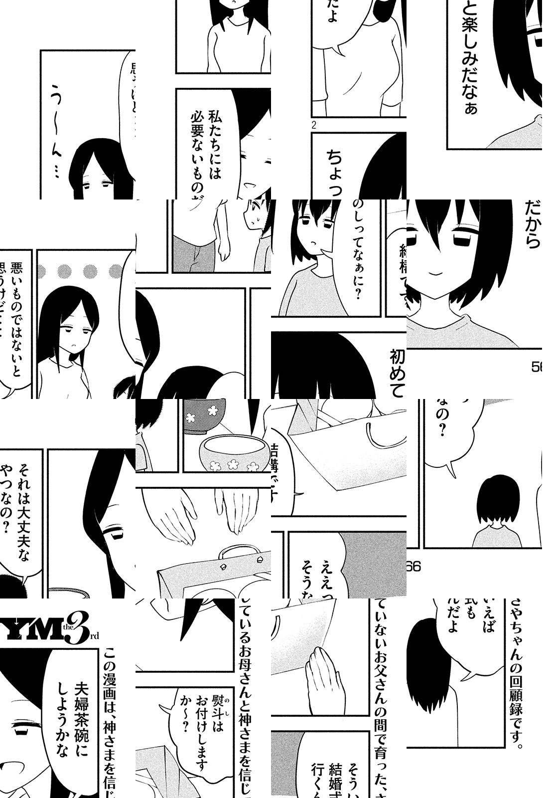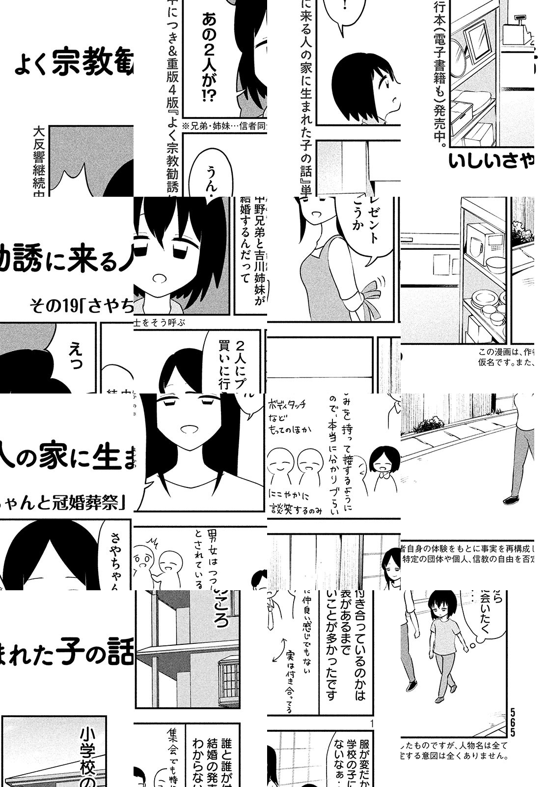さやちゃんが幼いころ、母が新興宗教へ入信。信者たちが目指すのは、神の教えの通りに規律正しく行動し、崩壊後の世界で復活し、楽園で永遠に暮らすこと。さやちゃんは二世信者として母親や周りの信者から厳しく監視され、学校でも浮いた存在に。交際禁止、漫画禁止、国歌禁止、輸血禁止etc...禁止だらけの生活で感じたことを、ありのままにつづる、衝撃の告白漫画。