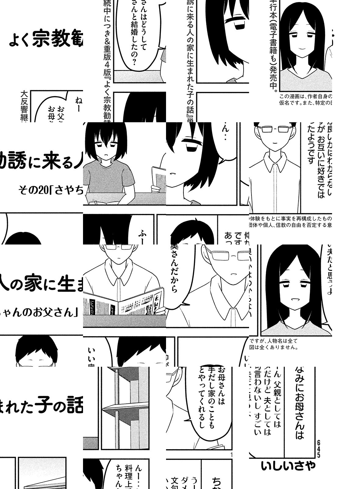 さやちゃんが幼いころ、母が新興宗教へ入信。信者たちが目指すのは、神の教えの通りに規律正しく行動し、崩壊後の世界で復活し、楽園で永遠に暮らすこと。さやちゃんは二世信者として母親や周りの信者から厳しく監視され、学校でも浮いた存在に。交際禁止、漫画禁止、国歌禁止、輸血禁止etc...禁止だらけの生活で感じたことを、ありのままにつづる、衝撃の告白漫画。