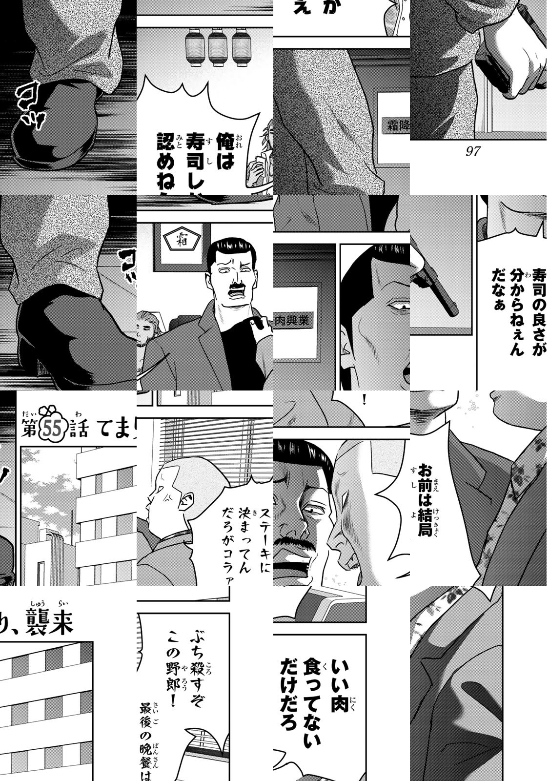 暴力団「霜降肉組」の新人組員・紺田 照(こんだ てる)、高校3年生。彼が任侠道のほかに心血を注ぐのは「お料理」! 切った張ったの世界で生きながら、硝煙にふとサバの塩焼きを思ってしまう…そんな紺田の今日の晩ご飯は!?