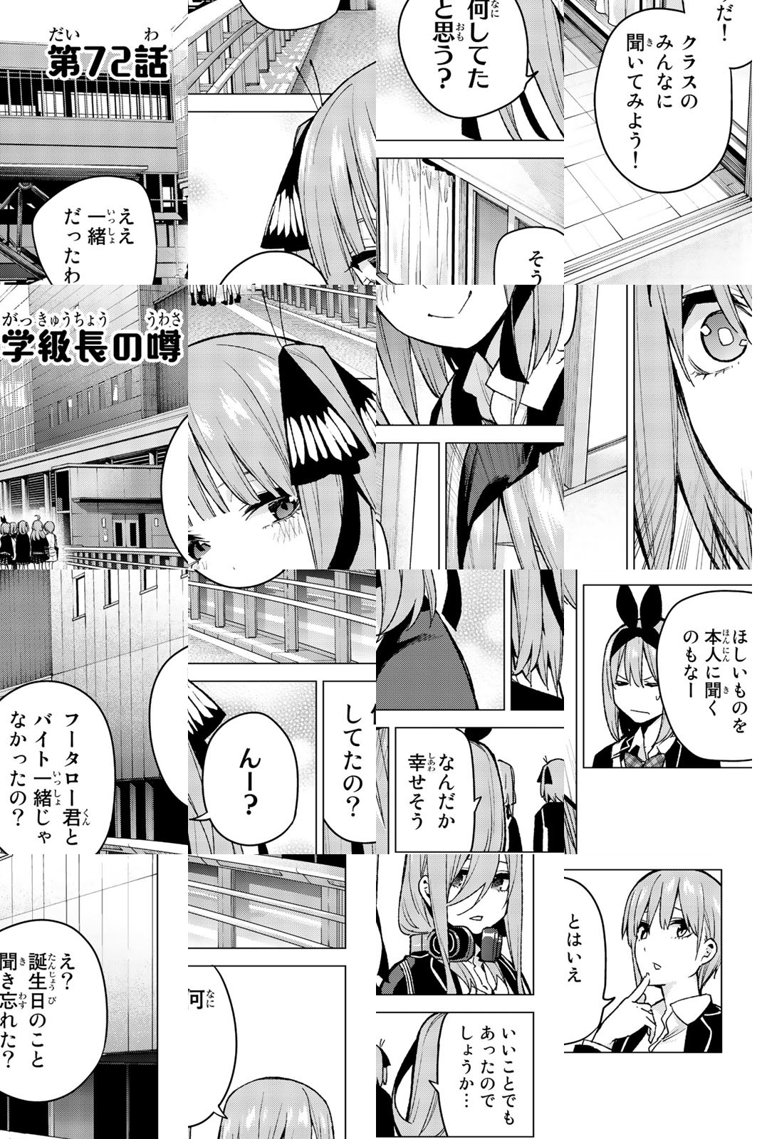 貧乏な生活を送る高校2年生・上杉風太郎のもとに、好条件の家庭教師アルバイトの話が舞い込む。ところが教え子はなんと同級生!! しかも五つ子だった!! 全員美少女、だけど「落第寸前」「勉強嫌い」の問題児! 最初の課題は姉妹からの信頼を勝ち取ること…!? 毎日がお祭り騒ぎ! 中野家の五つ子が贈る、かわいさ500%の五人五色ラブコメ開演!!
