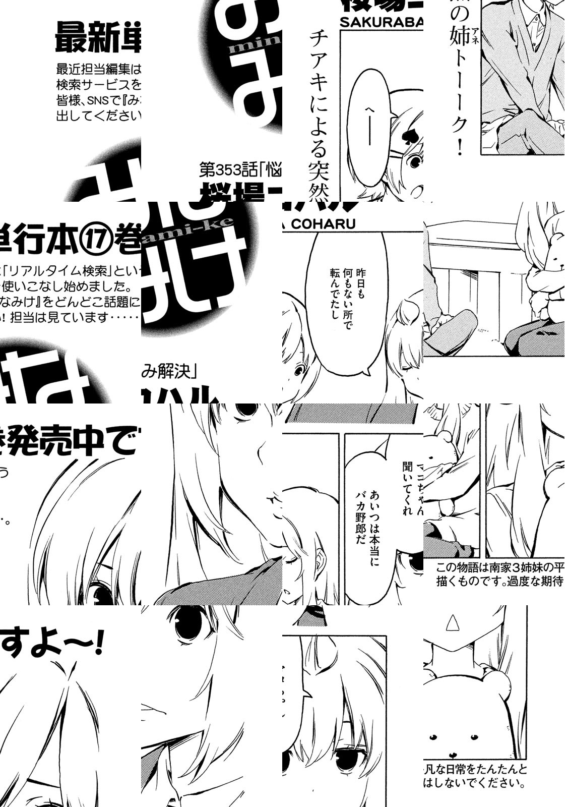 南さんちの3姉妹、その平凡な日常をまったりと。ハルカ、カナ、チアキ、小学生・中学生・高校生と取りそろえた、南家(みなみけ)の3姉妹が贈るワンダフルまったりショートストーリー。他愛もない日常の事件が、時に大きく、いつもは小さく発展していくサマをお楽しみください。