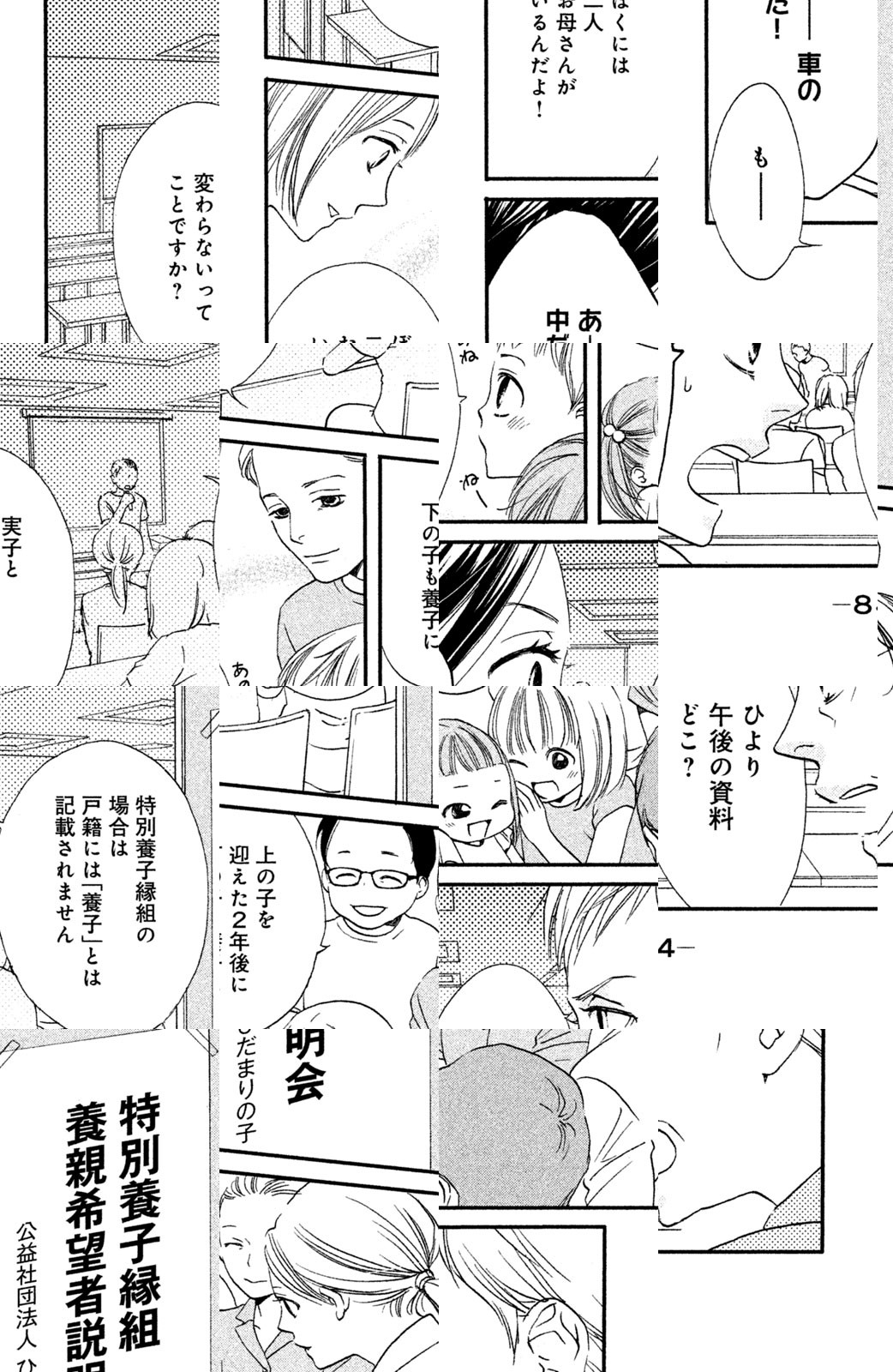 さまざまな事情で産みの親による養育が困難な子どもを、新たな温かい家庭に迎え入れる特別養子縁組。民間養子縁組あっせん機関「ひだまりの子」のケースワーカーとして働く主人公・ひよりの元には、予期せぬ妊娠や不妊に悩む人々が訪れる。家族にとって一番大切なのは心の繋がりだと信じ、親と子に寄り添うひより。複雑な時代だからこそ読んでほしい、新しい「かぞく」の形を描いた感動作!待望のコミックス1巻発売!