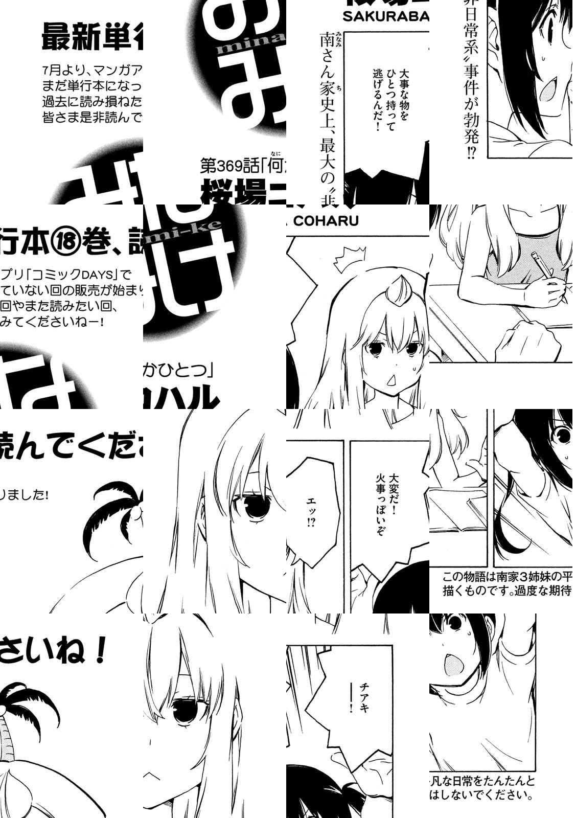南さんちの3姉妹、その平凡な日常をまったりと。ハルカ、カナ、チアキ、小学生・中学生・高校生と取りそろえた、南家(みなみけ)の3姉妹が贈るワンダフルまったりショートストーリー。他愛もない日常の事件が、時に大きく、いつもは小さく発展していくサマをお楽しみください。