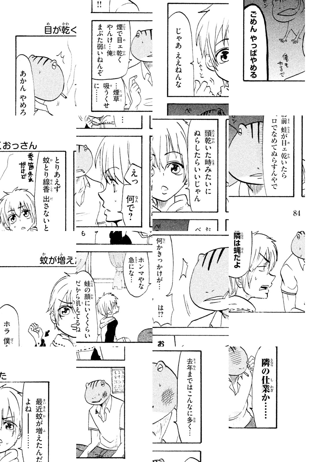 僕の名前は大野ユキオ。小学生です。僕の家には優しいお母さんと、頭が蛙で体がおっさんの蛙のおっさんがいます。…………………なんでだろう? 中年両生類と小学生の脱力同棲4コマ開幕!