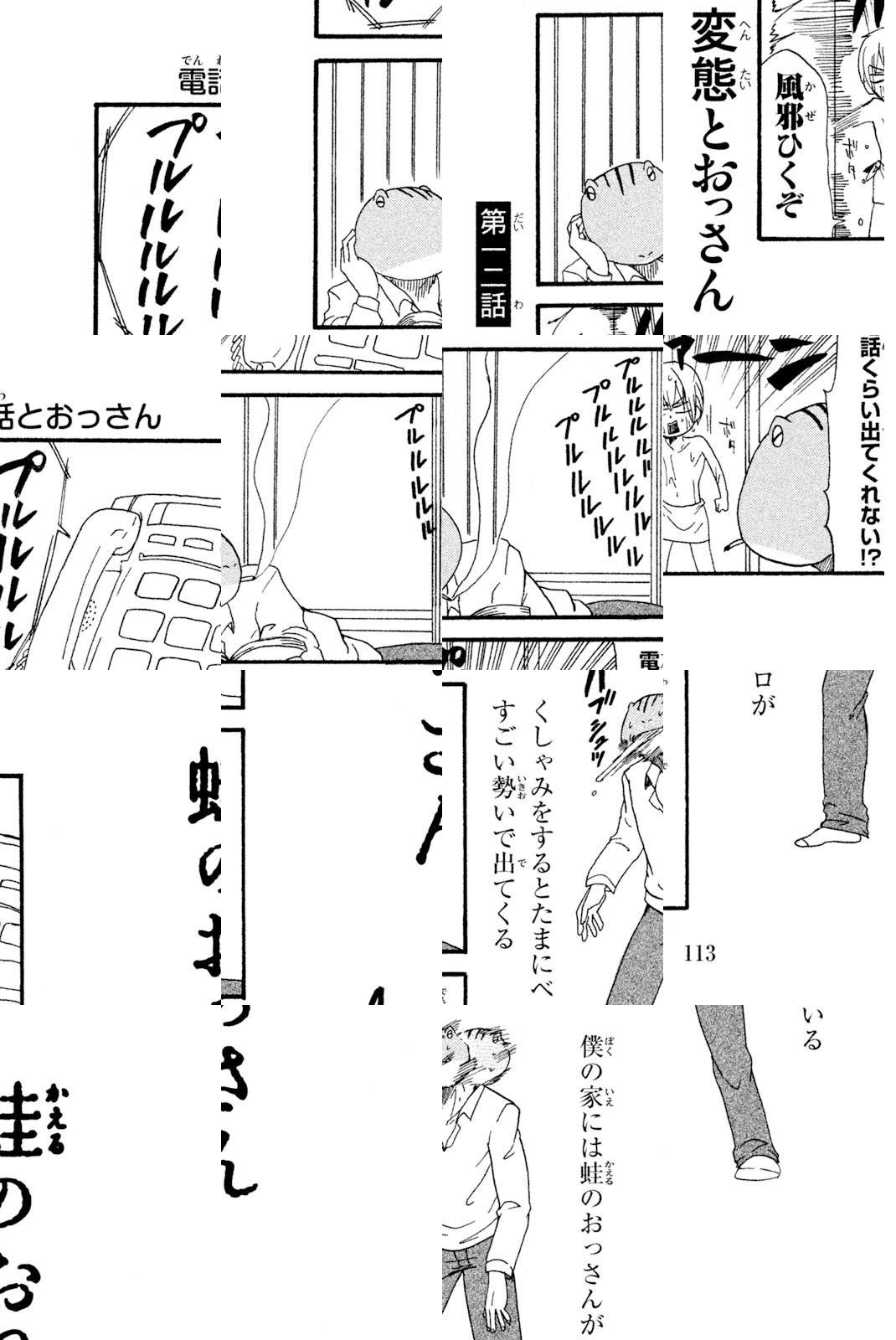 僕の名前は大野ユキオ。小学生です。僕の家には優しいお母さんと、頭が蛙で体がおっさんの蛙のおっさんがいます。…………………なんでだろう? 中年両生類と小学生の脱力同棲4コマ開幕!