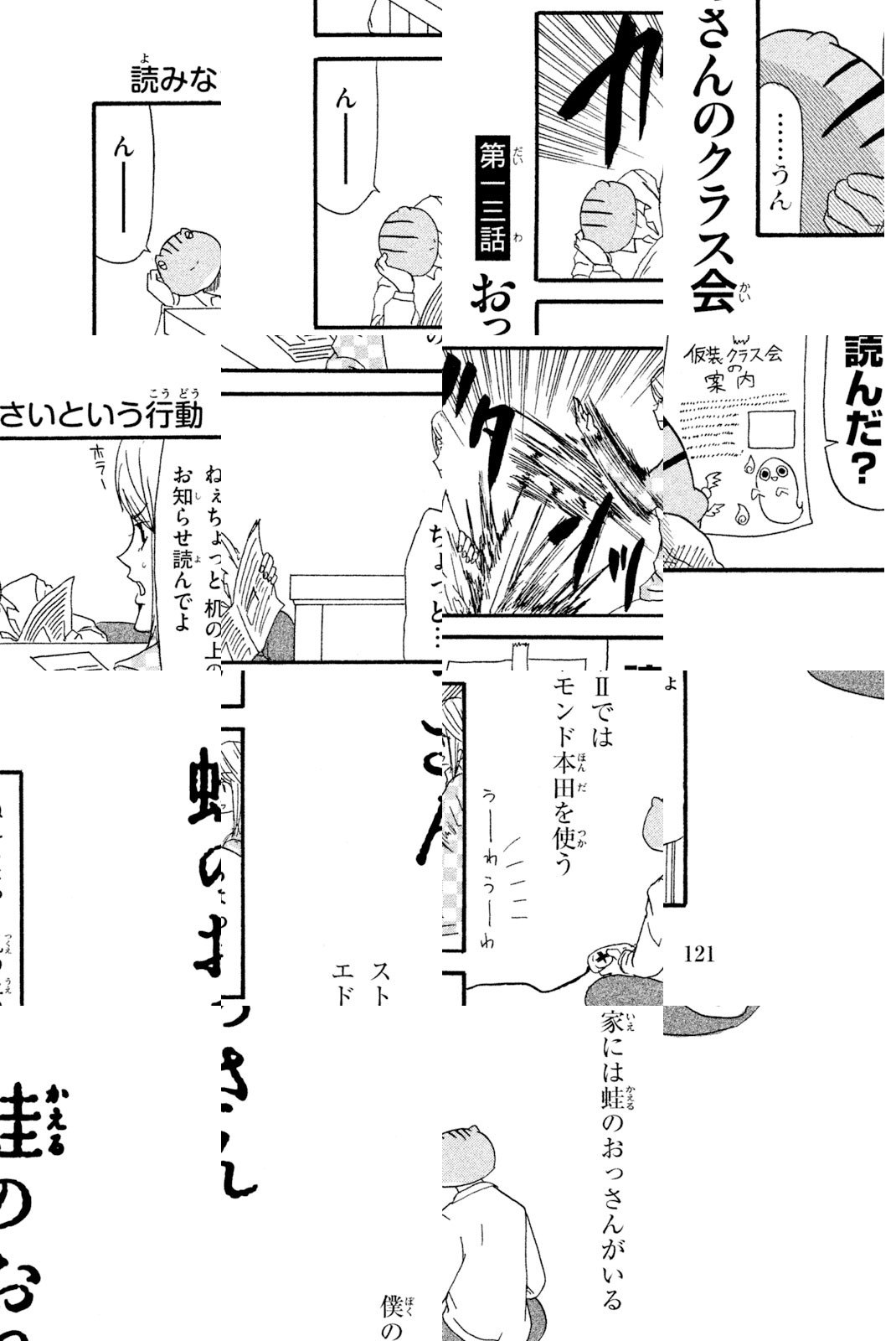 僕の名前は大野ユキオ。小学生です。僕の家には優しいお母さんと、頭が蛙で体がおっさんの蛙のおっさんがいます。…………………なんでだろう? 中年両生類と小学生の脱力同棲4コマ開幕!