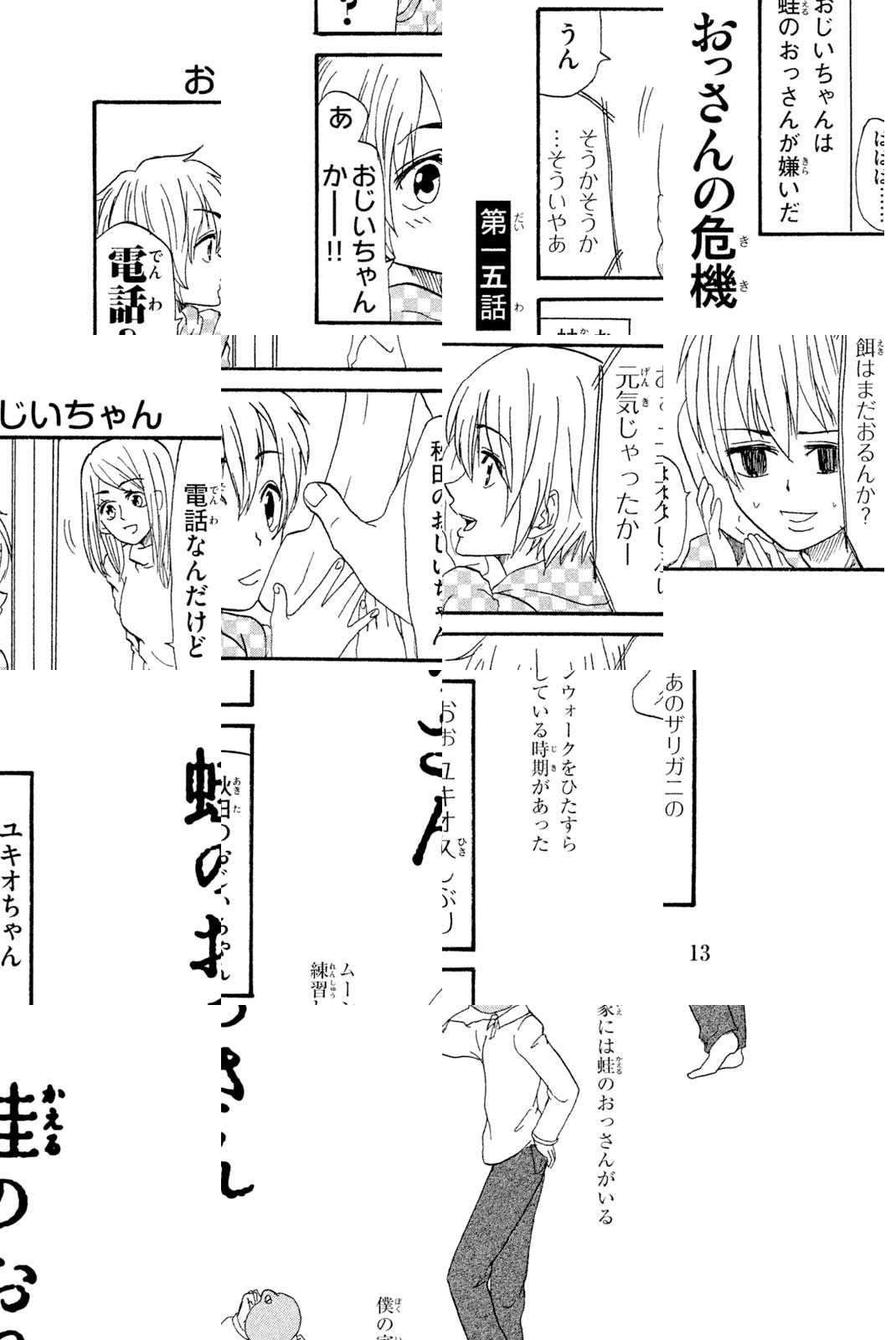 僕の名前は大野ユキオ。小学生です。僕の家には優しいお母さんと、頭が蛙で体がおっさんの蛙のおっさんがいます。…………………なんでだろう? 中年両生類と小学生の脱力同棲4コマ開幕!