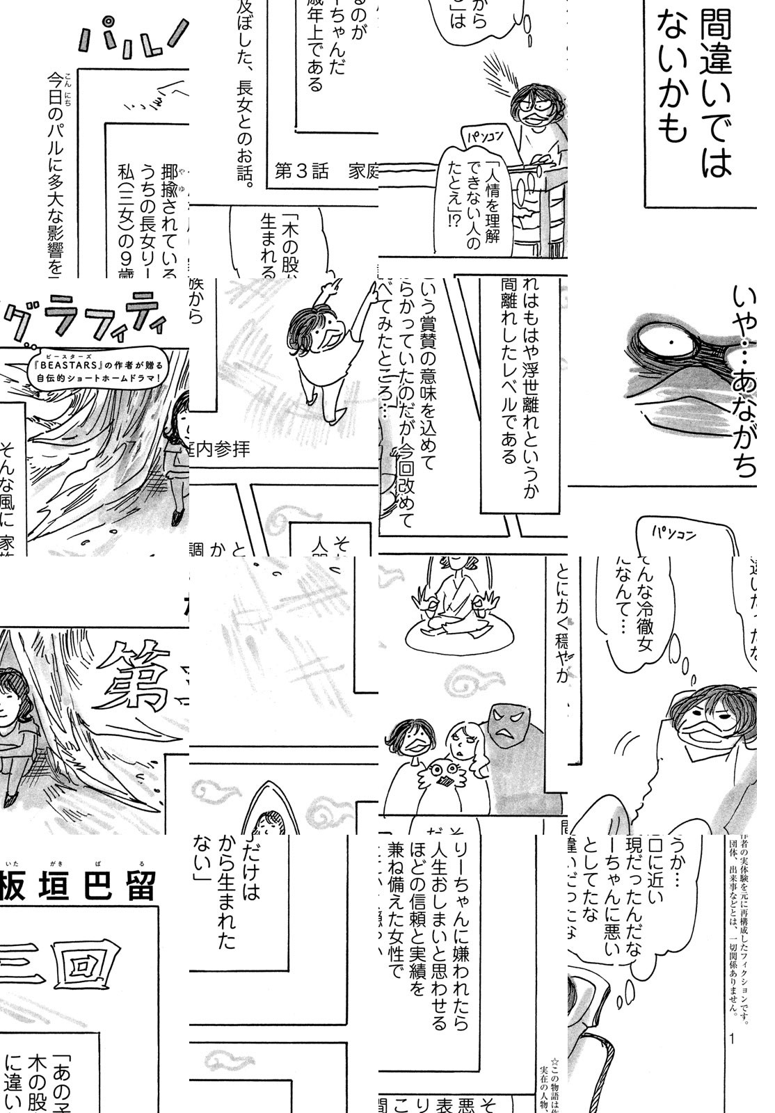 マンガ大賞2018をはじめ主要漫画賞を総ナメにした話題作『BEASTARS』の作者が贈る、くすっと笑った後にほろっと泣ける自伝的ショートホームドラマ! 板垣家のひねくれた末っ子だったパルが、なんでも褒めてくれる母、いつでも穏やかな長女、流行大好きなギャルだった次女、そして自分が生まれる前から漫画を描き続けている父との、大人になった今も胸に残る思い出を綴ります。