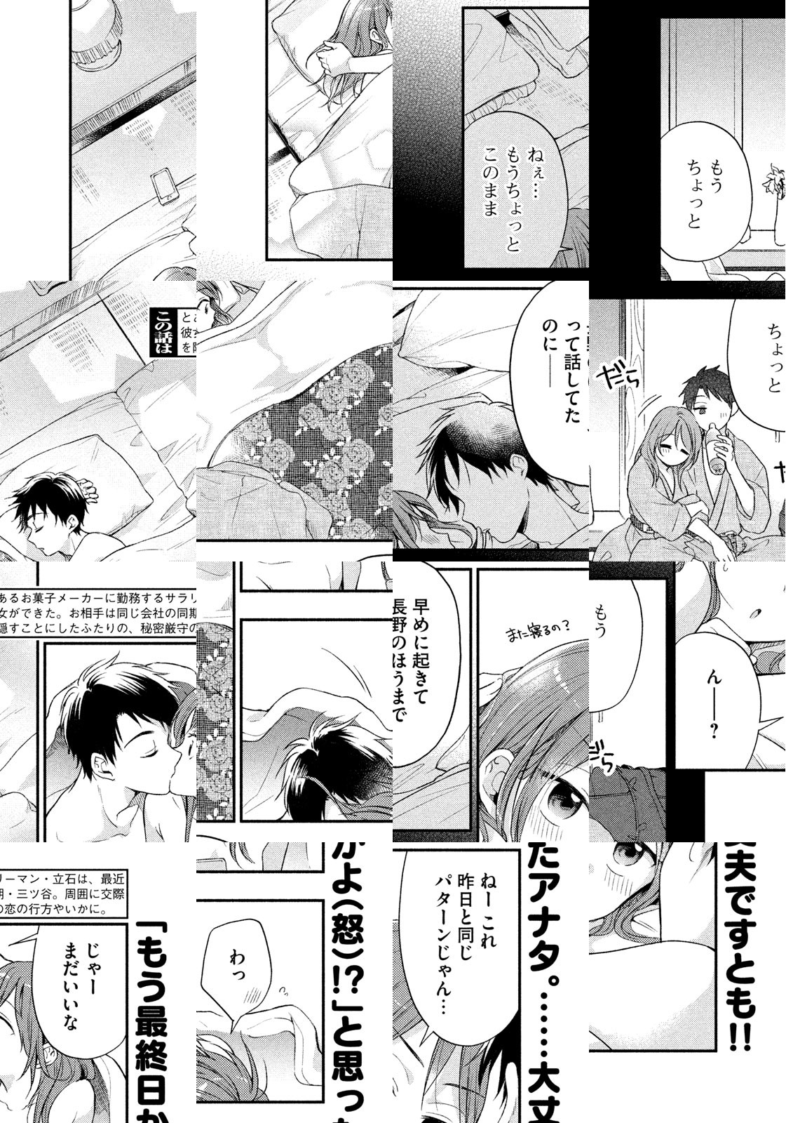 「俺たち、付き合わない?……内緒で」お菓子メーカーの経理部に勤めるアラサー男子・立石には、秘密があった。それは、昨日できたばかりの、かわいい恋人の存在。なぜなら相手は、同じ会社の企画部で働く勝気な同期女子・三ツ谷だから――! してないひとも、あこがれてるひとも、迷惑してるひとも、きっと言いたいことがある。ちょっとは覗いてみたくなる。秘密厳守のピュア社内恋愛ストーリー!