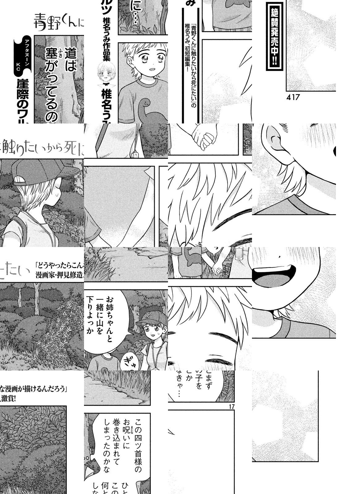 君に触れるなら、死んでもいいよ。これがわたしの愛なんだ。アフタヌーン公式サイト「モアイ」掲載の1話が300000PV突破で話題! 天然少女・優里ちゃんと、その彼氏・青野くん。ごく普通のお付き合いをしていたふたりだが、ある日突然、青野くんが「いなくなって」しまう……。絶対に結ばれないし、触れ合えないふたりの、でたらめで切実すぎるラブ・ストーリー。