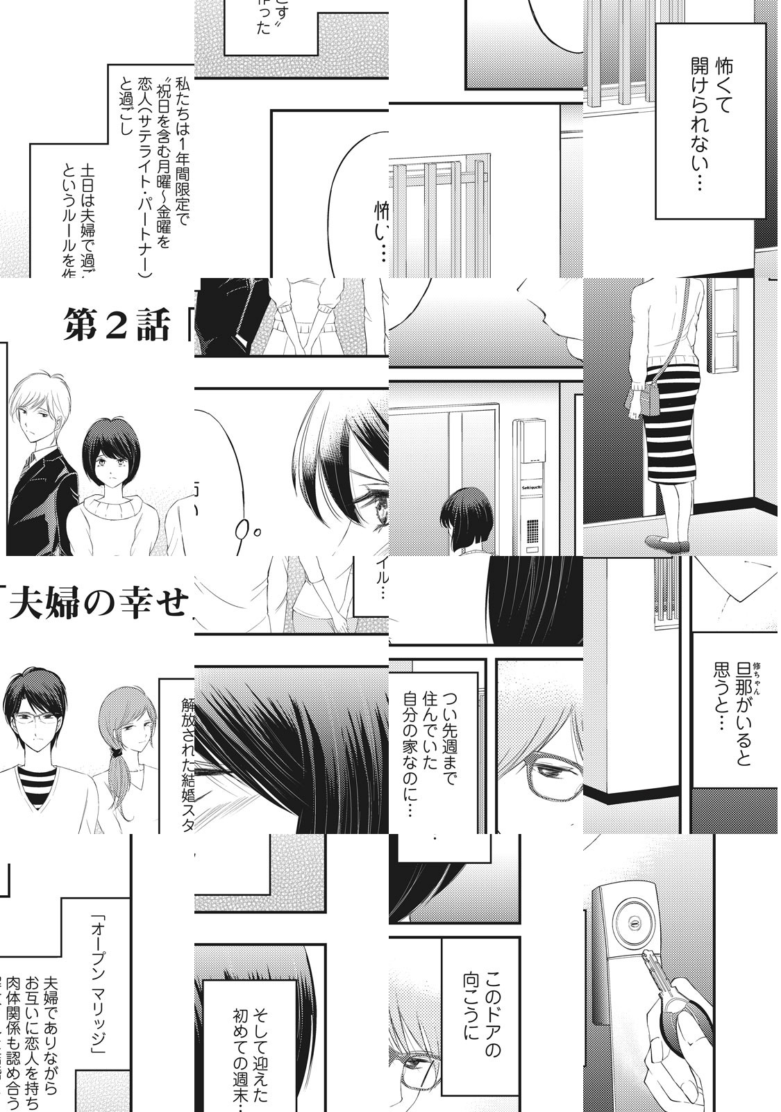 恋愛時代の情熱はなくなったけど、仲が良くて幸せな夫婦生活を送っていると思っていた小春。ところがある日突然、夫の修一から「彼女」を紹介され、あげくの果てに「オープンマリッジ」――婚姻関係は維持しつつ、お互いに婚外恋愛をしよう、という提案をされる。ショックを受け、最初は婚外恋愛にも抵抗を示していた小春だったが、中学時代の片思いの先輩・早宮と恋人契約を結んで以降、次第に……!?