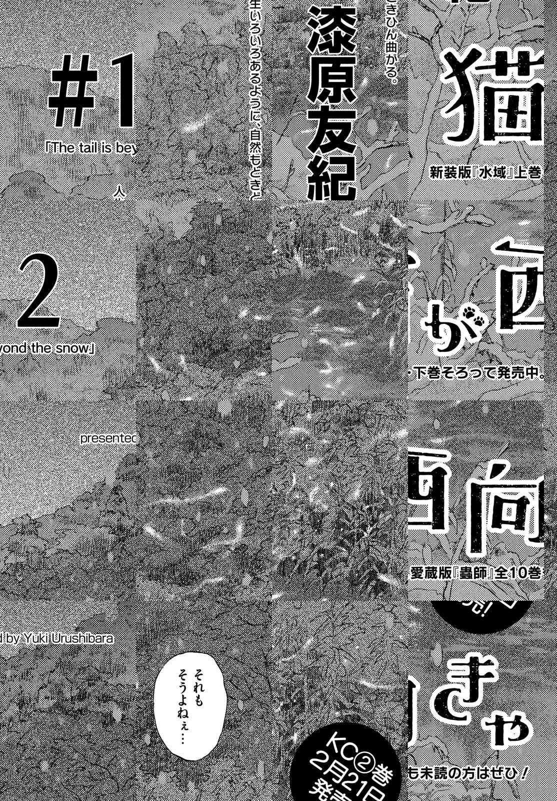 漆原友紀(『蟲師』『水域』)の最新タイトルは、”フロー”と呼ばれる奇妙な自然現象を処理するフロー業者・ヒロタと、アルバイトの智万ちゃん(見ため12歳、実年齢35歳)、そして”しゃちょう”(猫)が贈るストレンジなお仕事活劇! 三叉路が七叉路に増殖してたり、物体のカドがぜんぶ丸くなってたり、鏡の中に鏡反転の世界が生まれてたり。そんな変な光景を見かけたら、それは”フロー”。自然もときどき間違えるのだ。