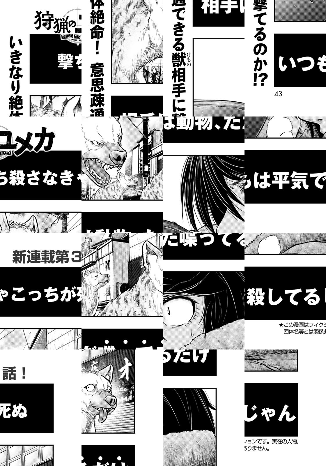 期待の新鋭が描く、「人×獣」異種間チームバトルロワイアル堂々開幕! 突如あらわれた人の言葉を解する獣たち。女性猟師・ユメカがある日突入したのは、獣に対する人の優位性が大きく揺らぐ世界だった。反目しながら、ときに異種間タッグチームとして協力し合い、謎に満ちたこの世界を生き抜くことはできるのか――!?