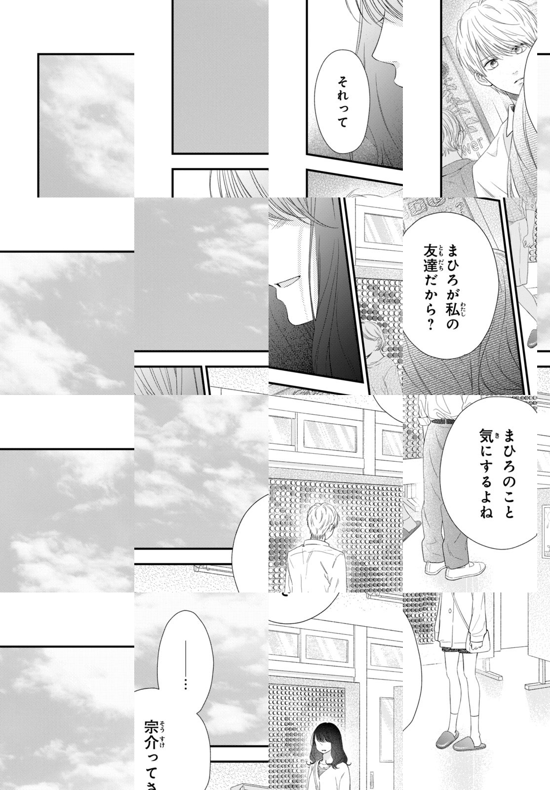 中3、冬。季節外れの転校生・茉紘(まひろ)を優しく受け入れてくれた千穂(ちほ)と人懐っこい宗介(そうすけ)。千穂と宗介は家が隣同士の幼なじみ。家族じゃないけど、お互いがお互いの特別な人――そんな2人の関係に憧れを抱く茉紘。その気持ちは、やがて宗介への初めての恋に変わっていって…。