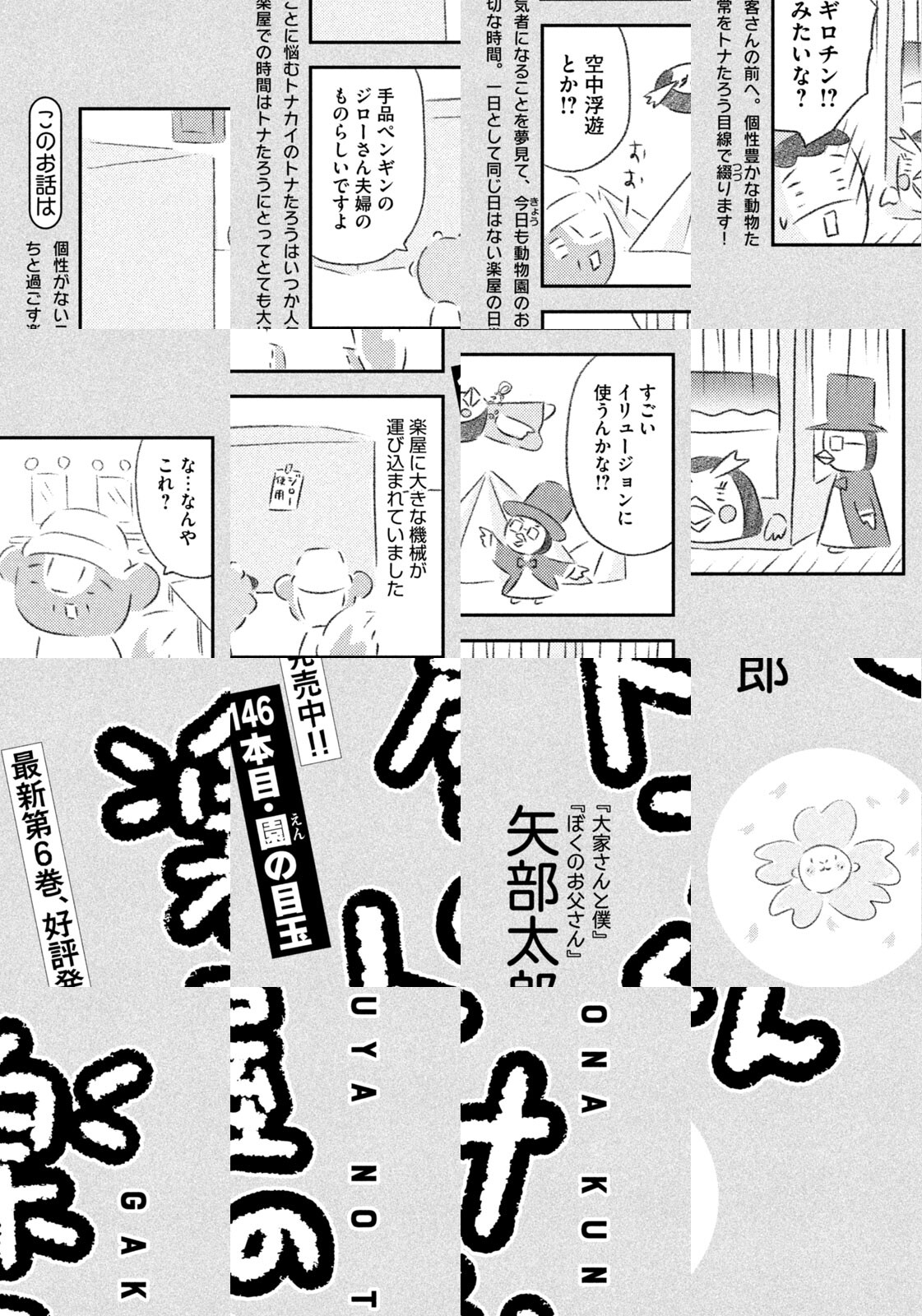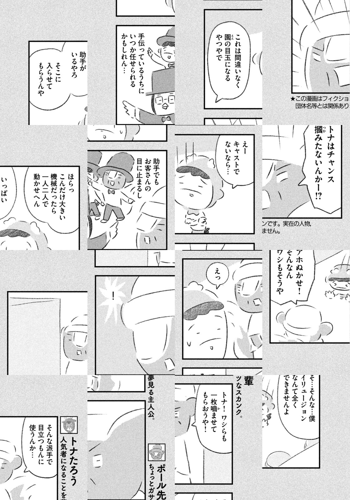 先輩にはいびられ、後輩には舐められ、お客さんには気づかれない主人公・トナカイのトナたろう、ちょっとガサツでデリカシーのないスカンクのポール先輩、元気すぎるお猿のアーコ、大人気のパンダくんなど、どこか見たことあるような動物たちの楽屋での悲喜こもごもなアニマル賛歌。自分の才能や“動物関係”に今日も悩みながら切磋琢磨する動物たちの舞台裏を覗いてみませんか?