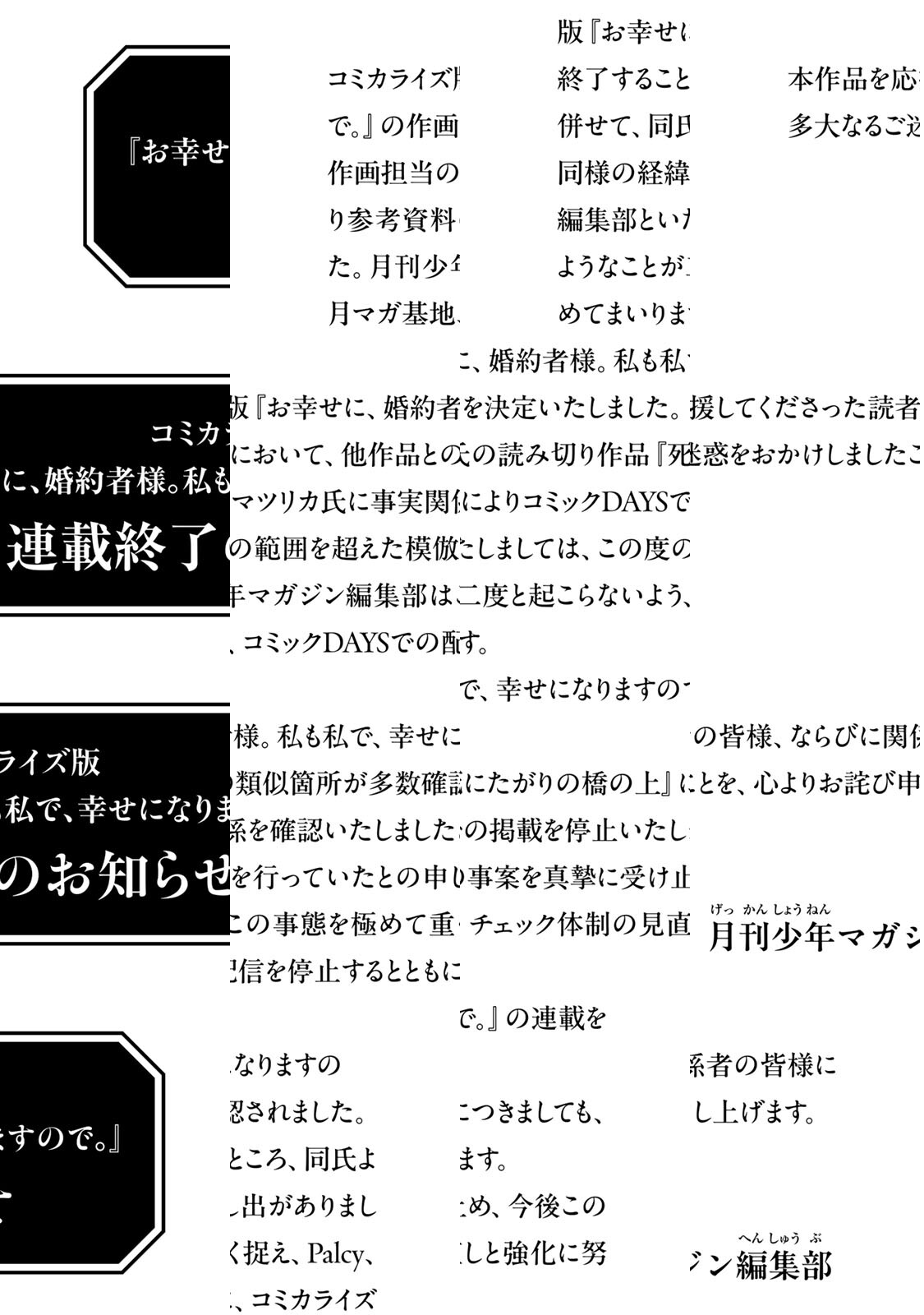 【コミカライズ版『お幸せに、婚約者様。私は私で、幸せになりますので。』連載終了のお知らせ】コミカライズ版『お幸せに、婚約者様。私は私で、幸せになりますので。』の作画において、他作品との類似箇所が多数確認されました。作画担当のマツリカ氏に事実関係を確認いたしましたところ、同氏より参考資料の範囲を超えた模倣を行っていたとの申し出がありました。月刊少年マガジン編集部はこの事態を極めて重く捉え、Palcy、月マガ基地、コミックDAYSでの配信を停止するとともに、コミカライズ版『お幸せに、婚約者様。私は私で、幸せになりますので。』の連載を終了することを決定いたしました。併せて、同氏の読み切り作品『死にたがりの橋の上』につきましても、同様の経緯によりコミックDAYSでの掲載を停止いたします。編集部といたしましては、この度の事案を真摯に受け止め、今後このようなことが二度と起こらないよう、チェック体制の見直しと強化に努めてまいります。本作品を応援してくださった読者の皆様、ならびに関係者の皆様に多大なるご迷惑をおかけいたしましたことを、心よりお詫び申し上げます。