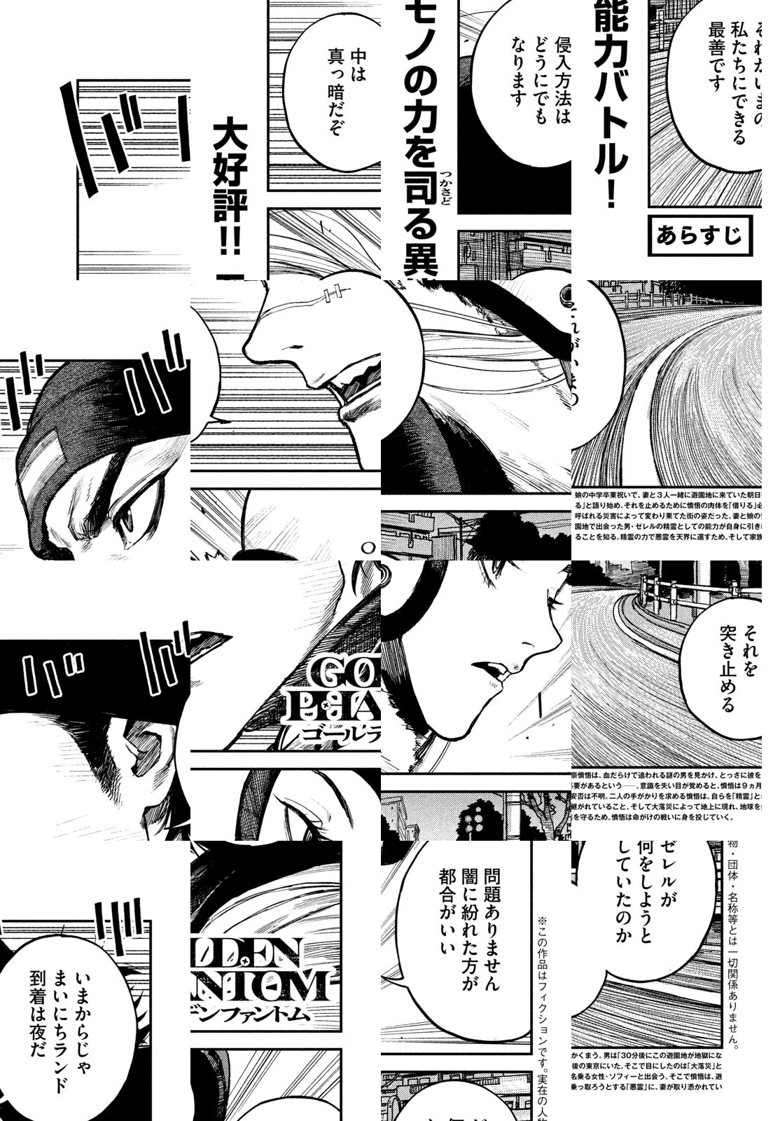 娘の中学卒業祝いで、妻と一緒に遊園地に来ていた朝日奈慎吾は、血だらけで追われる謎の男を見かけ、とっさに観覧車に同乗し彼をかくまう。男は「30分後にこの遊園地が地獄になる」と語り始める。それを止めるためには、慎吾の肉体を「借りる」必要があるというが……。ものを媒介として能力「ゴールデンファントム」を使う者たちの、前代未聞の異能力バトル開幕!!