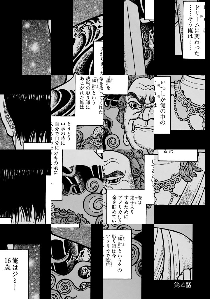 子どものころ、「勝針」という凄腕の彫り師に、命を助けてもらったジミーこと大西勝也。その出来事をきっかけに、和彫りに魅せられた彼は、自らの手で自分の身体に和彫りを入れ、将来は「勝針」の元で修業し、世界一の彫り師になることを目指すようになる。薔薇十字学園高校・工業科1年のジミーの周りには、彼を慕う仲間が多く集い、漢同士の闘いを繰り広げながら、熱い毎日を送っていく!