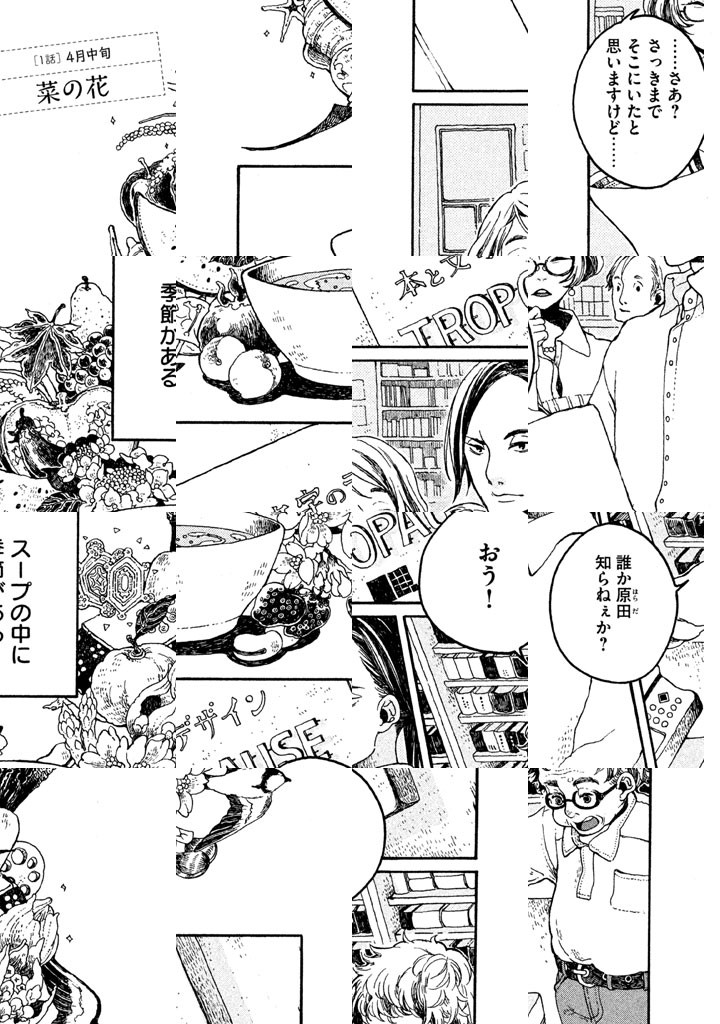 本の装丁家・原田織ヱ(26)は、スープが大好き。スープと言っても、種類は色々。思わず真似したくなる、四季折々のスープを、めしあがれ。【1巻のお品書き(一部)】菜の花とベーコンのミルク煮/春キャベツと豚肉のミルフィーユ/枇杷のコンポート/エスニック風スープカレーうどん/オクラとミョウガのおすい物/サバ缶の冷や汁/揚げ茄子のピリ辛煮びたし/トマトソース/トン汁/カブのポタージュ/鶏のブイヨン