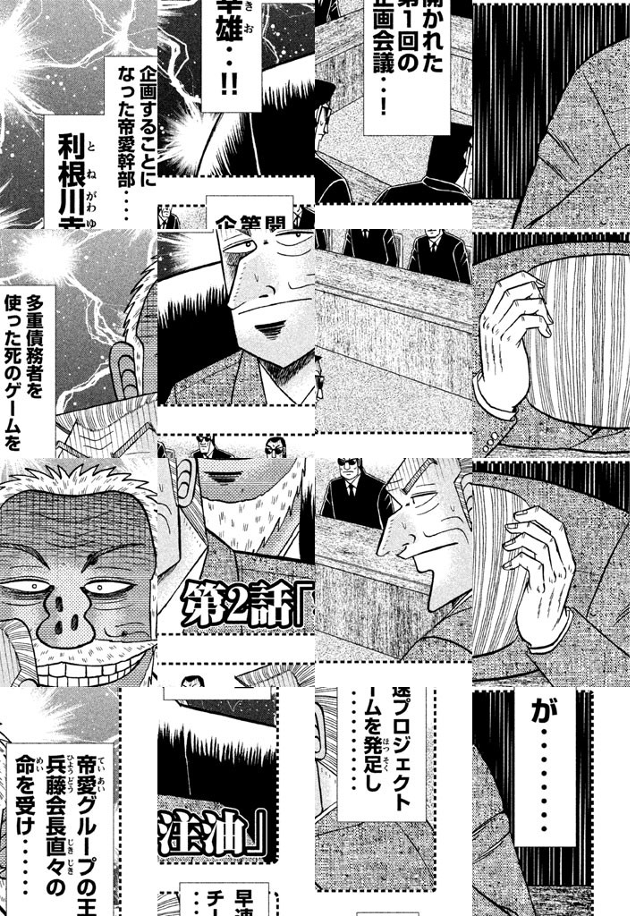 帝愛グループ会長・兵藤和尊の命で、債務者たちによる「死のゲーム」の企画を任された幹部・利根川幸雄!! 早速、企画会議を開く利根川を待っていたのは、受難‥!! 煩悶‥!! そして絶望‥!! 会長と黒服の間で苦悩する利根川を描く、悪魔的スピンオフ、始動・・・・!!