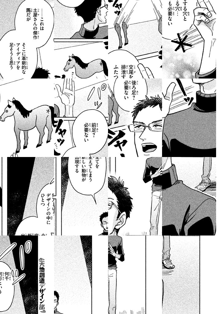 天界にある動物の「デザイン室」では、神様(クライアント)からのムチャ振りを受けて、日々さまざまな動物がデザインされていた。「ユニコーンってなんで存在しないの?」「美味しい生き物の条件って?」「海で最強の動物は?」「蛇と鳥、どっちが強い?」など、動物への素朴な疑問で楽しく学べる、動物創造コメディ!!