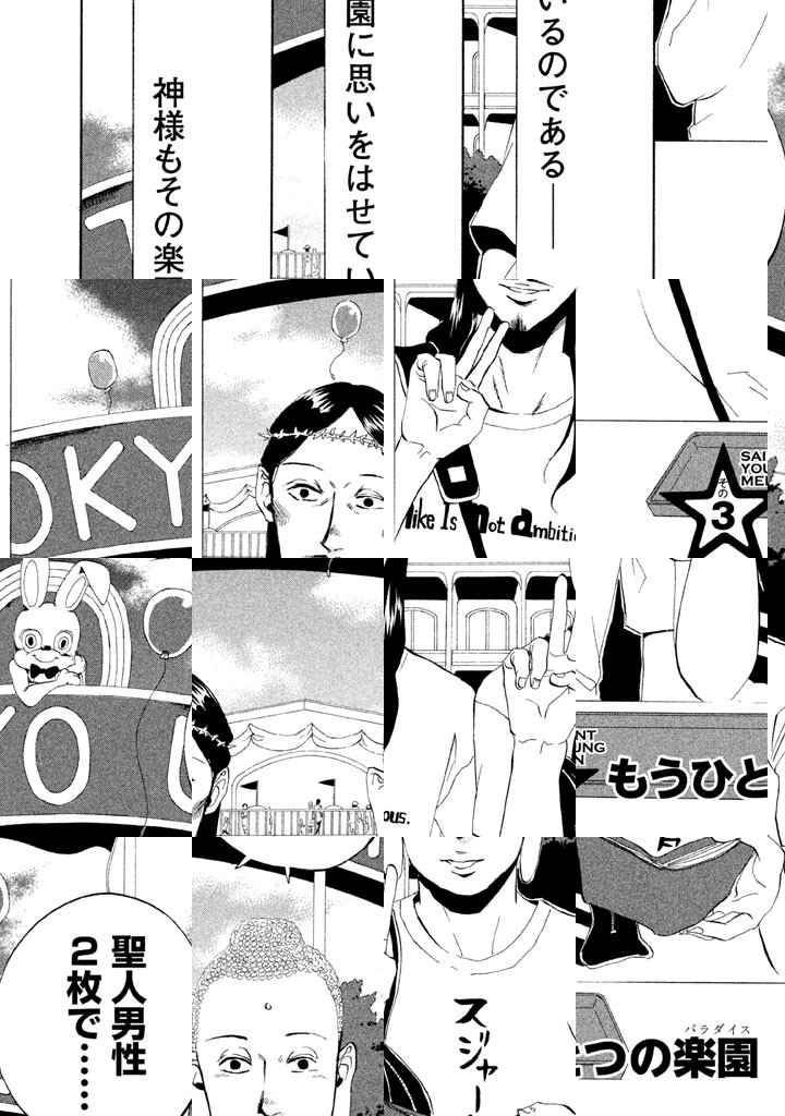 目覚めた人ブッダ、神の子イエス。世紀末を無事に越えた二人は、東京・立川でアパートをシェアし、下界でバカンスを過ごしていた。近所のおばあちゃんのように、細かいお金を気にするブッダ。衝動買いが多いイエス。そんな“最聖”コンビの立川デイズ。