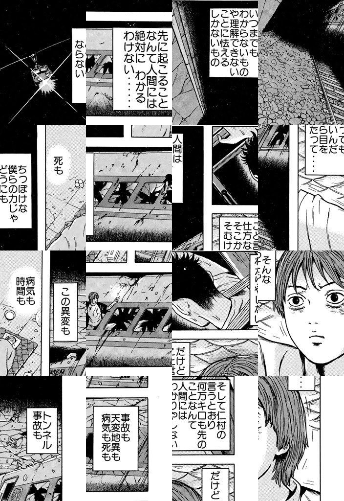 20世紀最後に放たれた、恐怖の大巨編「世紀末サバイバル」!! 修学旅行帰りの新幹線は、突然のトンネル落盤事故によってすべての光を失った……!! 闇につつまれ、血みどろになった凄惨な“墓所”。生存者はテル、アコ、ノブオ、3名のみ。ほか全員、即死……。酸素も食料も出口すらも断たれた少年たちは、次第に壊れゆく「心」と闘いながら、動きはじめる。たったひとつの“希望”――「東京に、家族のもとに帰ること」を、生き延びるための支えとして……!!!!