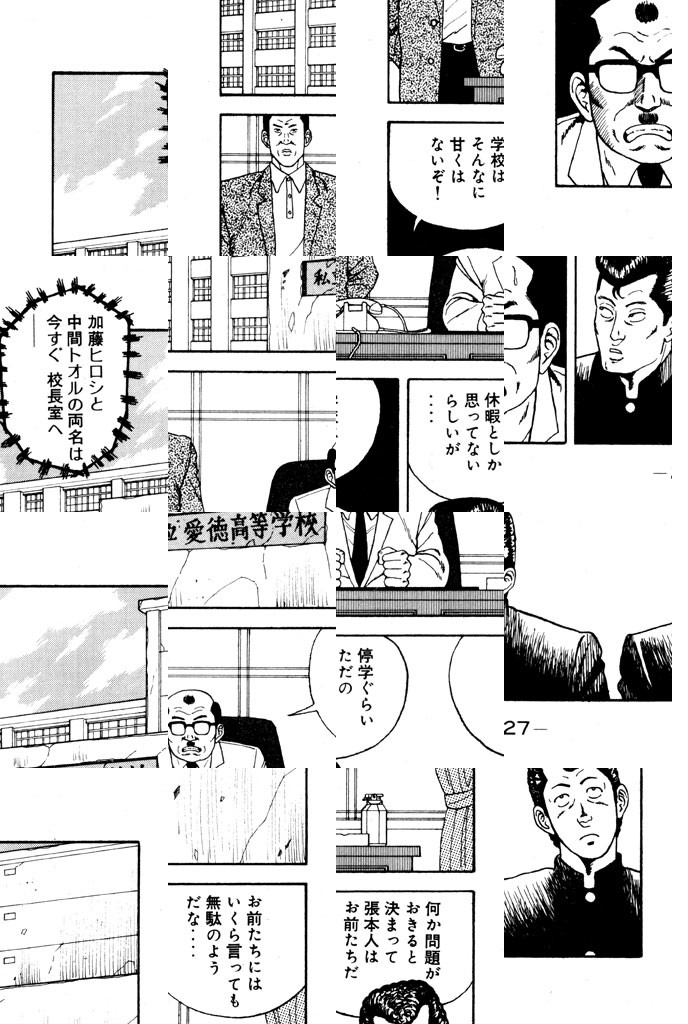 バリバリリーゼント印、本格ツッパリコンビのヒロシ&トオルは、私立愛徳(あいとく)高校のやっかいモン。ケンカにはめっぽうツオイが、カアイイ女のコにはいつでも完敗! しかし、めげずに「日々コレ抗争」とばかり、ガンつけて闊歩(かっぽ)する二人なのだ。