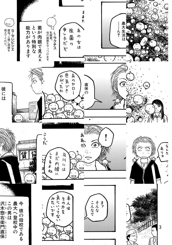 菌が見える特殊能力を持つ、もやし(種麹)屋の次男坊、沢木惣右衛門直保。彼は東京の某農大に入学する。農大を舞台に、沢木と研究室その他の仲間達、そして菌が活躍したりしなかったりのキャンパスライフ。大学生活のモラトリアム感と、菌が満載の「もやしもん」。あなたもぜひ、かもされてみてください。