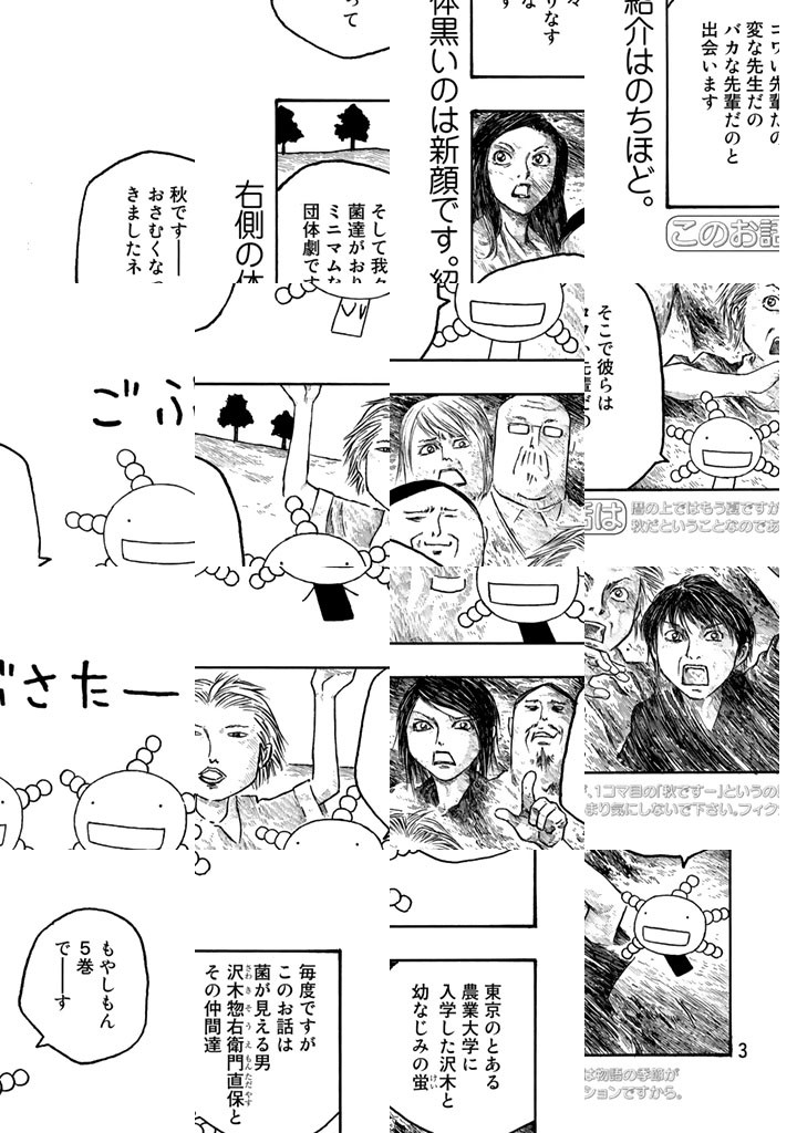 菌が見える特殊能力を持つ、もやし(種麹)屋の次男坊、沢木惣右衛門直保。彼は東京の某農大に入学する。農大を舞台に、沢木と研究室その他の仲間達、そして菌が活躍したりしなかったりのキャンパスライフ。大学生活のモラトリアム感と、菌が満載の「もやしもん」。あなたもぜひ、かもされてみてください。