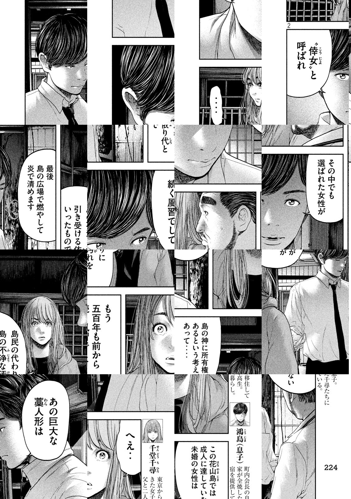 両親の離婚を機に、東京から地方の花山島に引っ越してきた女子高生・千堂千尋。彼女が移り住んだその島は、何かがおかしかった。露骨な部外者差別、突如行われる謎の儀式、そして島の真ん中に建てられた巨大な“給水塔”‥‥。島民同士が強固な繋がりを持つその島で、ある日、一人の漁師が自宅で滅多刺しにされる事件が起こる。島全体に猜疑心が湧き起こる中、見えてきた意外な犯人とは――。『生贄投票』の江戸川エドガワが描く、パラサイト・サイコスリラー!!