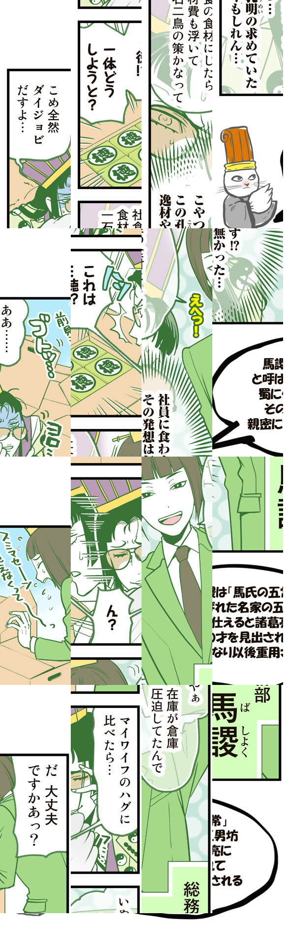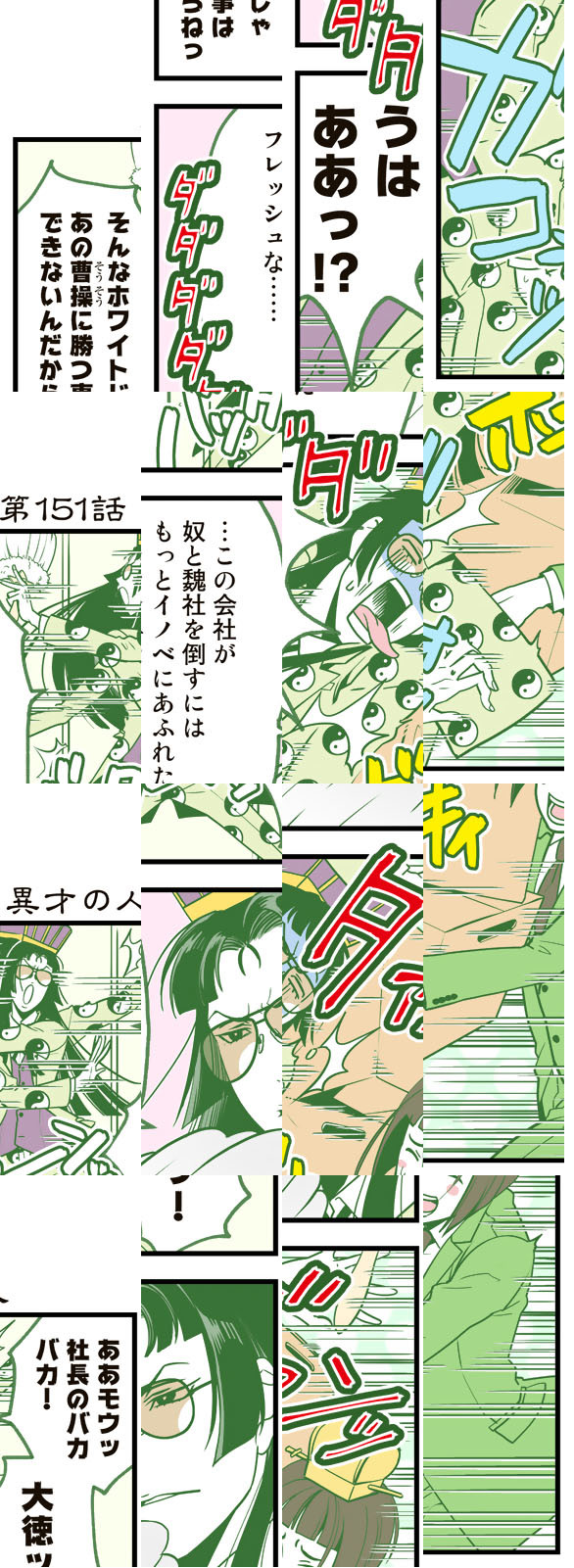 三国志といえば「魏(ぎ)」「呉(ご)」「蜀(しょく)」の三国による覇権争いが売りですが、この漫画では「魏」「呉」「蜀」はただの会社で、三国志の英傑たちはしがないサラリーマン。大商社「魏」の社長はサラリーマン川柳にご執心。三代続くおもちゃメーカー「呉」の社長は無気力体質。ITベンチャー企業「蜀」の若社長は「徳さえあれば金はいらない」主義者。いつだって困るのはそんな社長の下で働く社員たちです。
