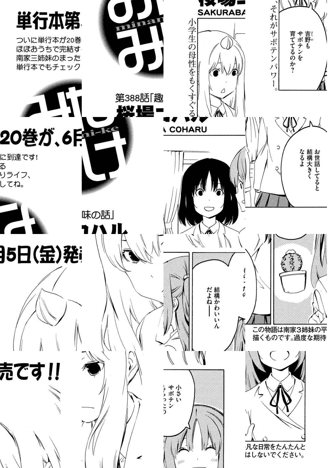 南さんちの3姉妹、その平凡な日常をまったりと。ハルカ、カナ、チアキ、小学生・中学生・高校生と取りそろえた、南家(みなみけ)の3姉妹が贈るワンダフルまったりショートストーリー。他愛もない日常の事件が、時に大きく、いつもは小さく発展していくサマをお楽しみください。