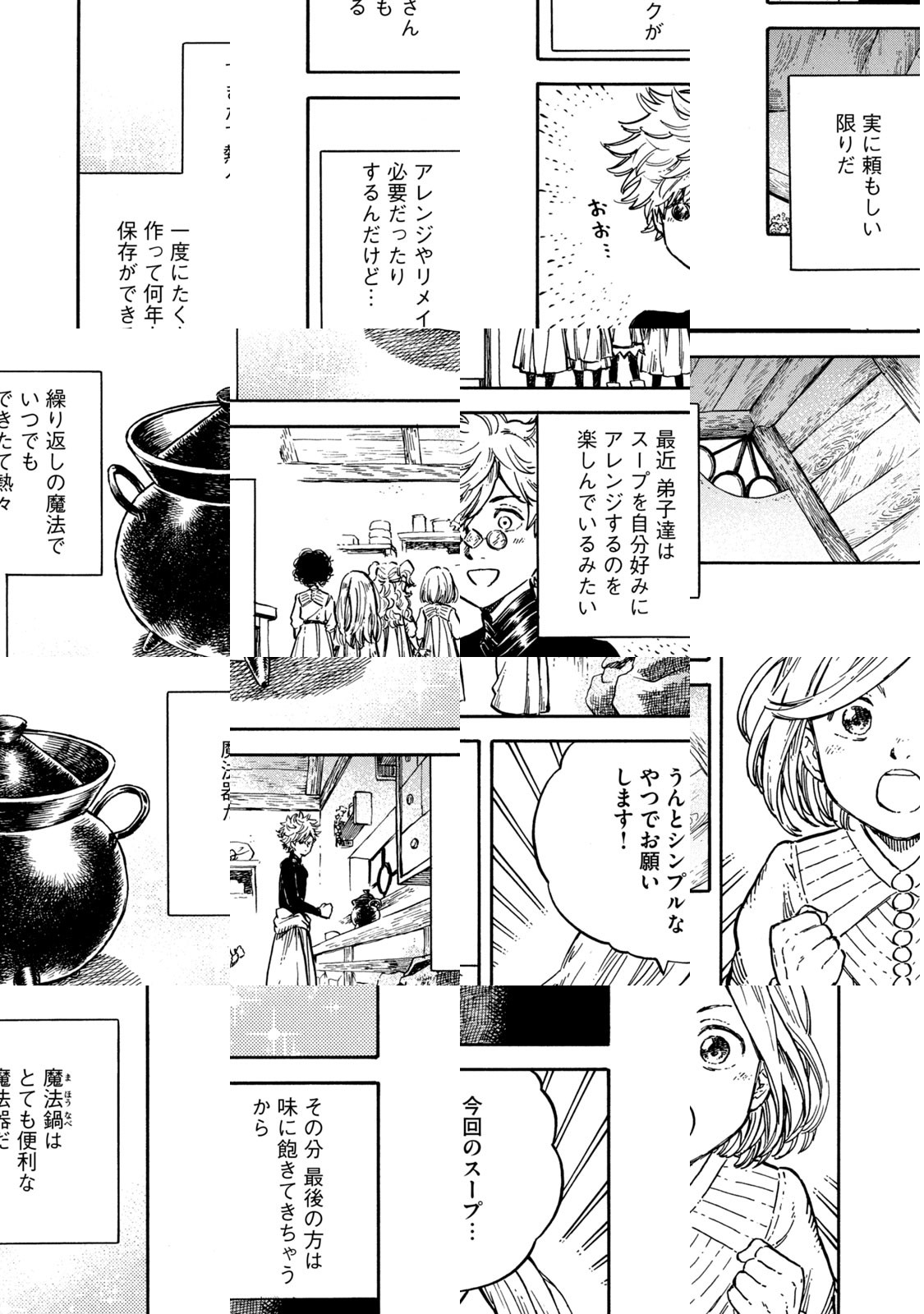 子供たちが寝静まったアトリエ。それは、大人が一瞬だけ自由になれる時間。昼間は多忙な魔法使い、キーフリーとオルーギオが、魔法を駆使して夜食を作る&食べる!『とんがり帽子のアトリエ』から、美味しいスピンオフが登場!