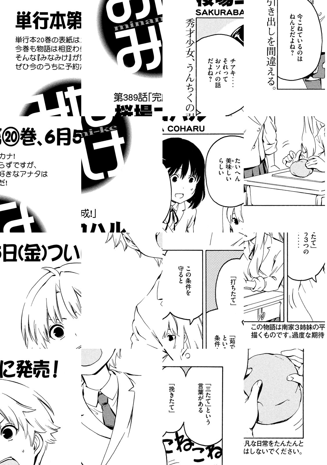 南さんちの3姉妹、その平凡な日常をまったりと。ハルカ、カナ、チアキ、小学生・中学生・高校生と取りそろえた、南家(みなみけ)の3姉妹が贈るワンダフルまったりショートストーリー。他愛もない日常の事件が、時に大きく、いつもは小さく発展していくサマをお楽しみください。