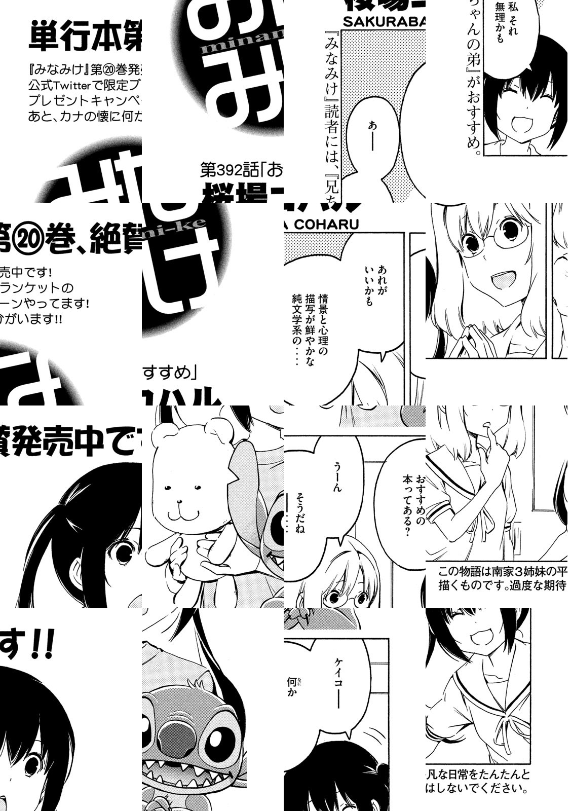 南さんちの3姉妹、その平凡な日常をまったりと。ハルカ、カナ、チアキ、小学生・中学生・高校生と取りそろえた、南家(みなみけ)の3姉妹が贈るワンダフルまったりショートストーリー。他愛もない日常の事件が、時に大きく、いつもは小さく発展していくサマをお楽しみください。
