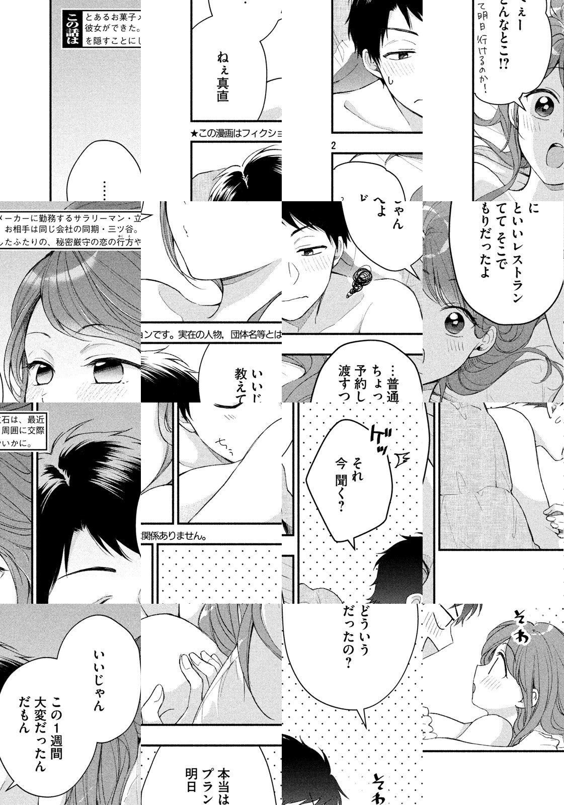 「俺たち、付き合わない?……内緒で」お菓子メーカーの経理部に勤めるアラサー男子・立石には、秘密があった。それは、昨日できたばかりの、かわいい恋人の存在。なぜなら相手は、同じ会社の企画部で働く勝気な同期女子・三ツ谷だから――! してないひとも、あこがれてるひとも、迷惑してるひとも、きっと言いたいことがある。ちょっとは覗いてみたくなる。秘密厳守のピュア社内恋愛ストーリー!