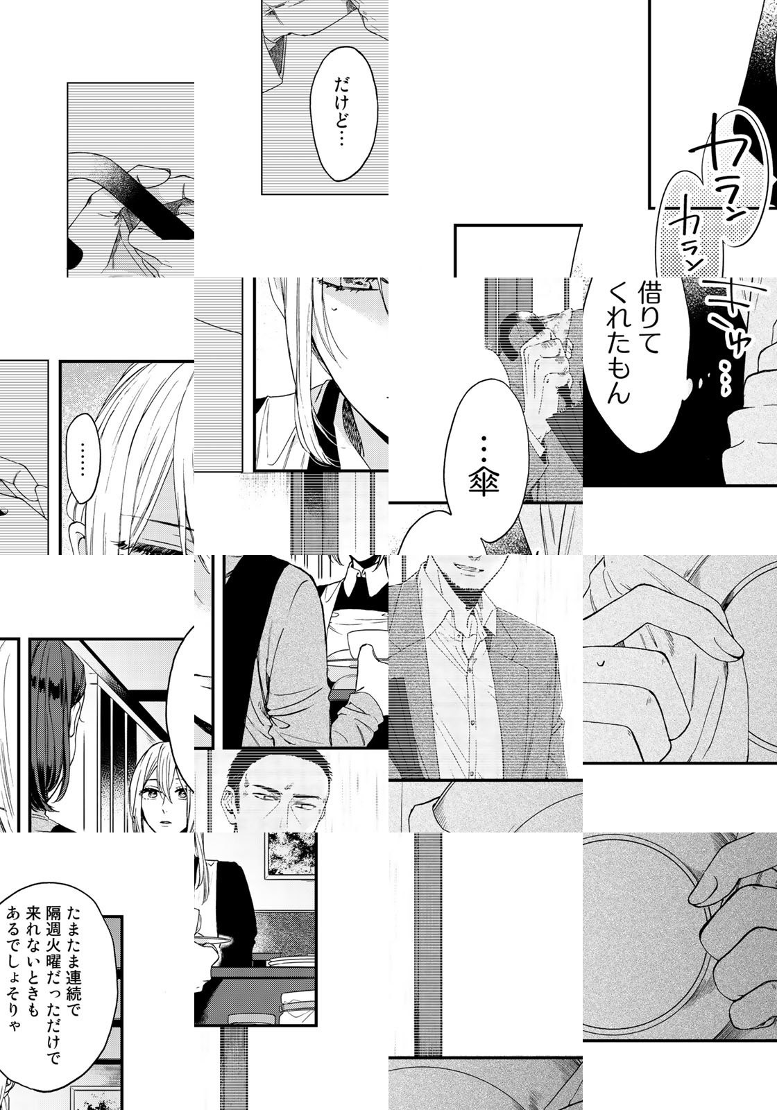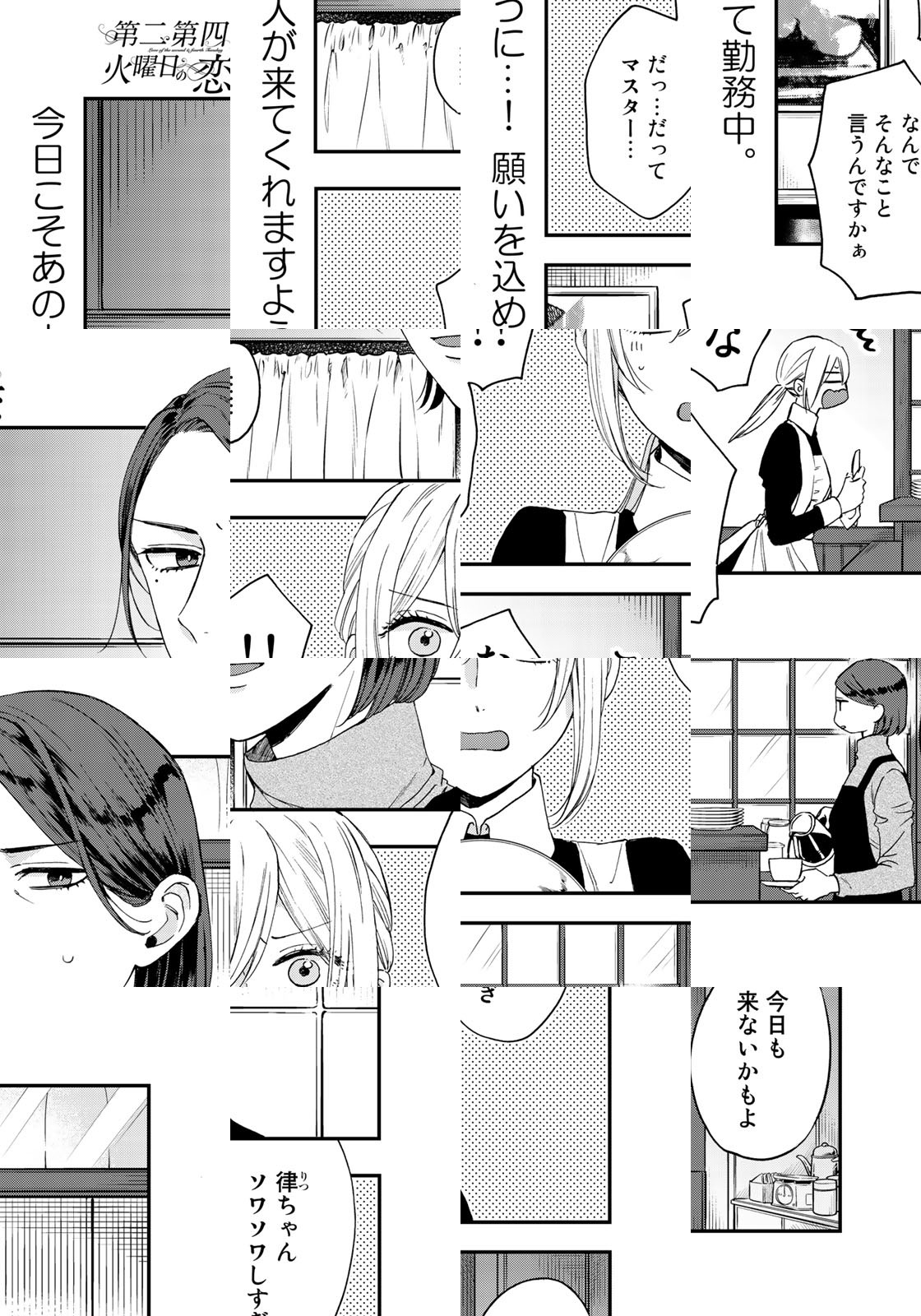 「あの人は第二第四火曜日にだけやってくる――」。喫茶店で働く律は、ある男性客に恋をしている。カタギに見えない、強面な外見。年齢・職業不詳。だけど気になるあの人のこと。あの人のことがもっと知りたい――。マッチングアプリでは探せない、「何も知らない」から始まる恋。美人ウエイトレスと謎の男。大人同士のピュアなラブストーリーが始まる。
